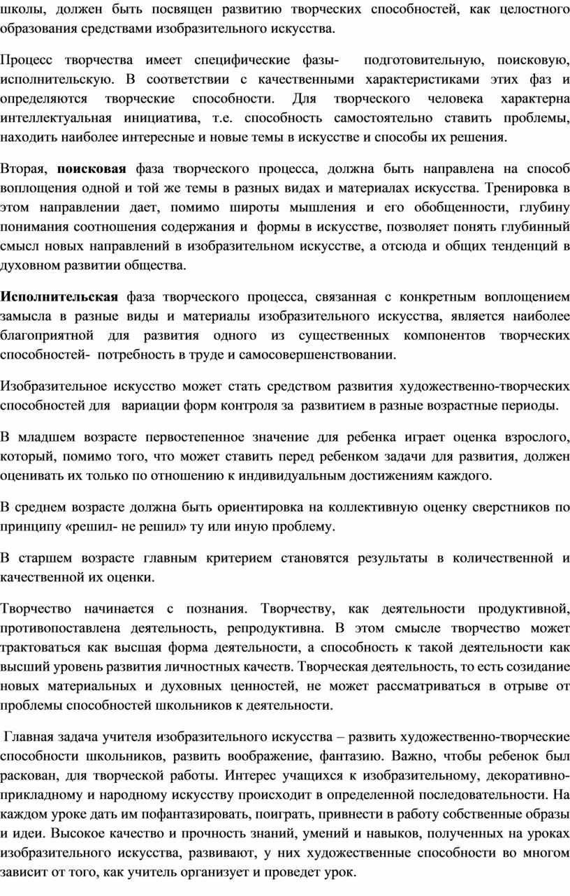 Исполнительская фаза творческого процесса, связанная с конкретным воплощением замысла в разные виды и материалы изобразительного искусства, является наиболее благоприятной для развития одного из существенных компонентов творческих способностей- потребность в труде и самосовершенствовании.
