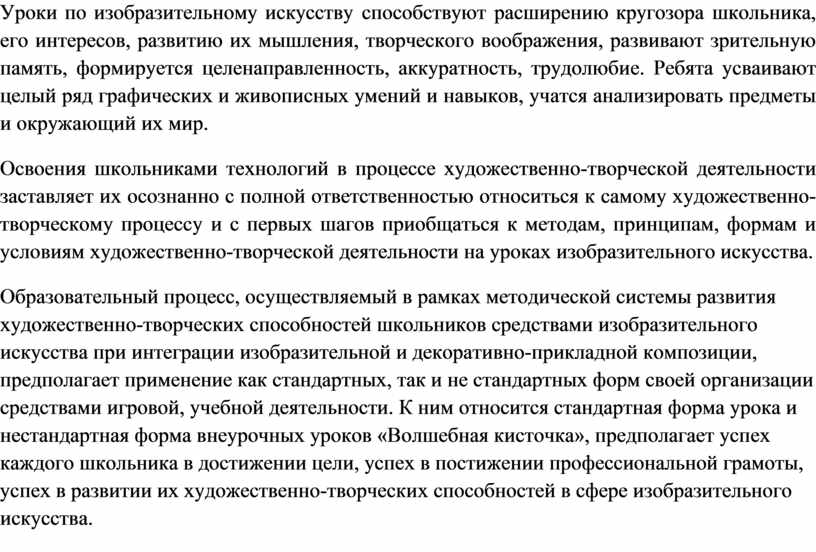 Образовательный процесс, осуществляемый в рамках методической системы развития художественно-творческих способностей школьников средствами изобразительного искусства при интеграции изобразительной и декоративно-прикладной композиции, предполагает применение как стандартных, так и не стандартных форм своей организации средствами игровой, учебной деятельности. К ним относится стандартная форма урока и нестандартная форма внеурочных уроков «Волшебная кисточка», предполагает успех каждого школьника в достижении цели, успех в постижении профессиональной грамоты, успех в развитии их художественно-творческих способностей в сфере изобразительного искусства.