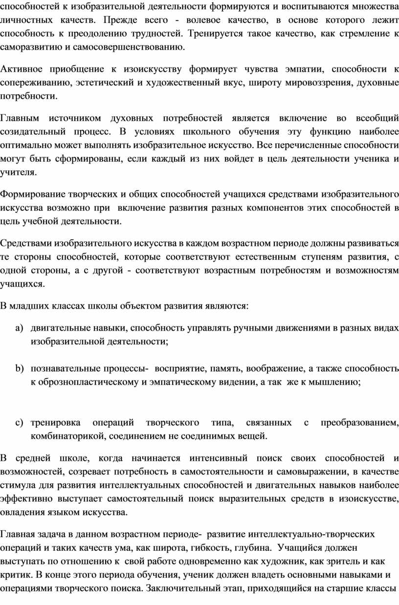 Средствами изобразительного искусства в каждом возрастном периоде должны развиваться те стороны способностей, которые соответствуют естественным ступеням развития, с одной стороны, а с другой - соответствуют возрастным потребностям и возможностям учащихся.