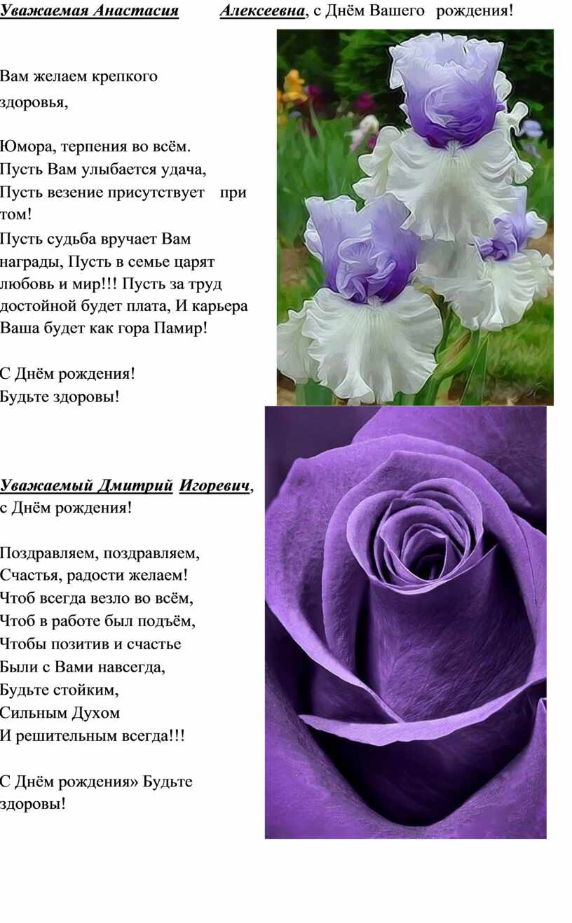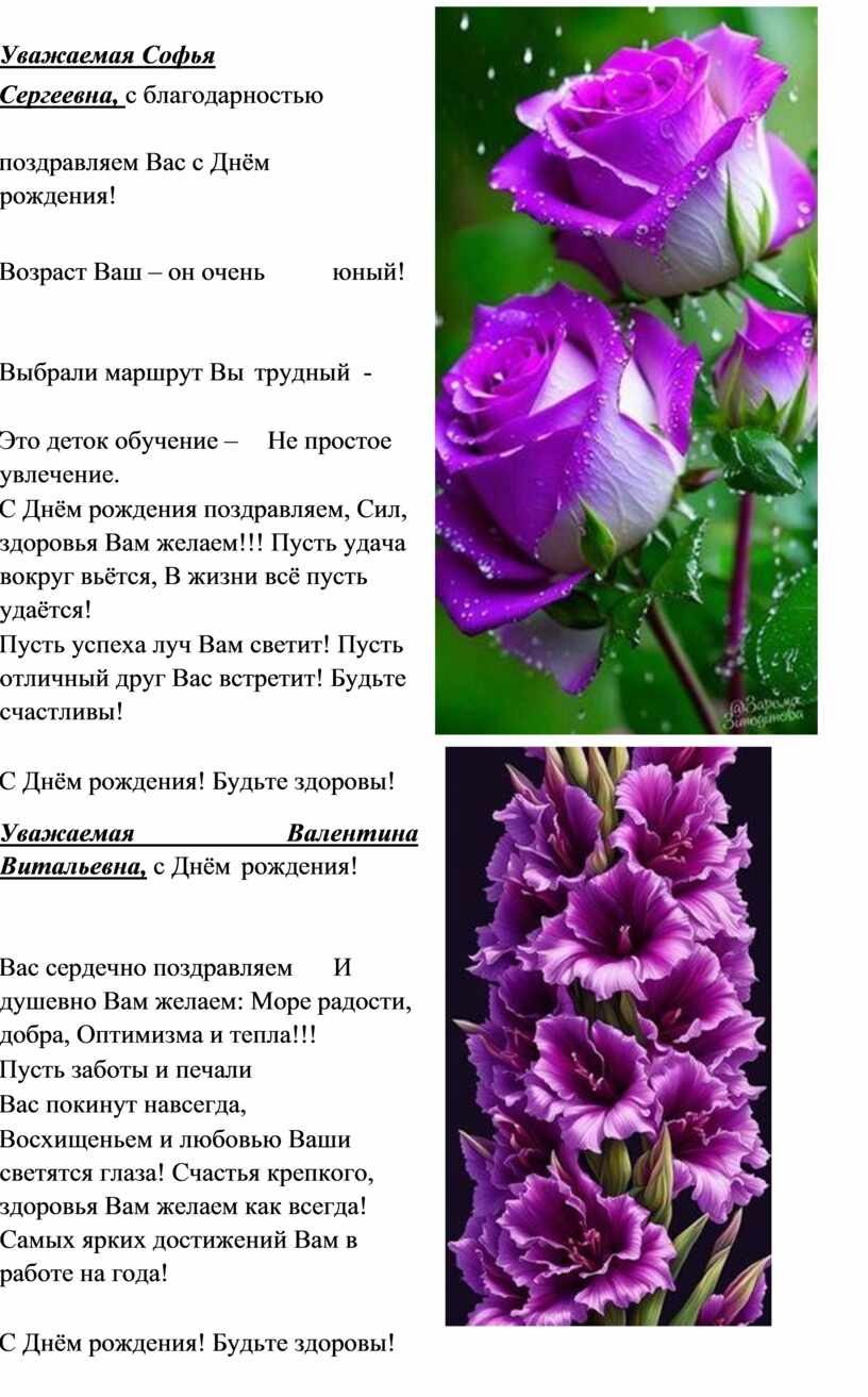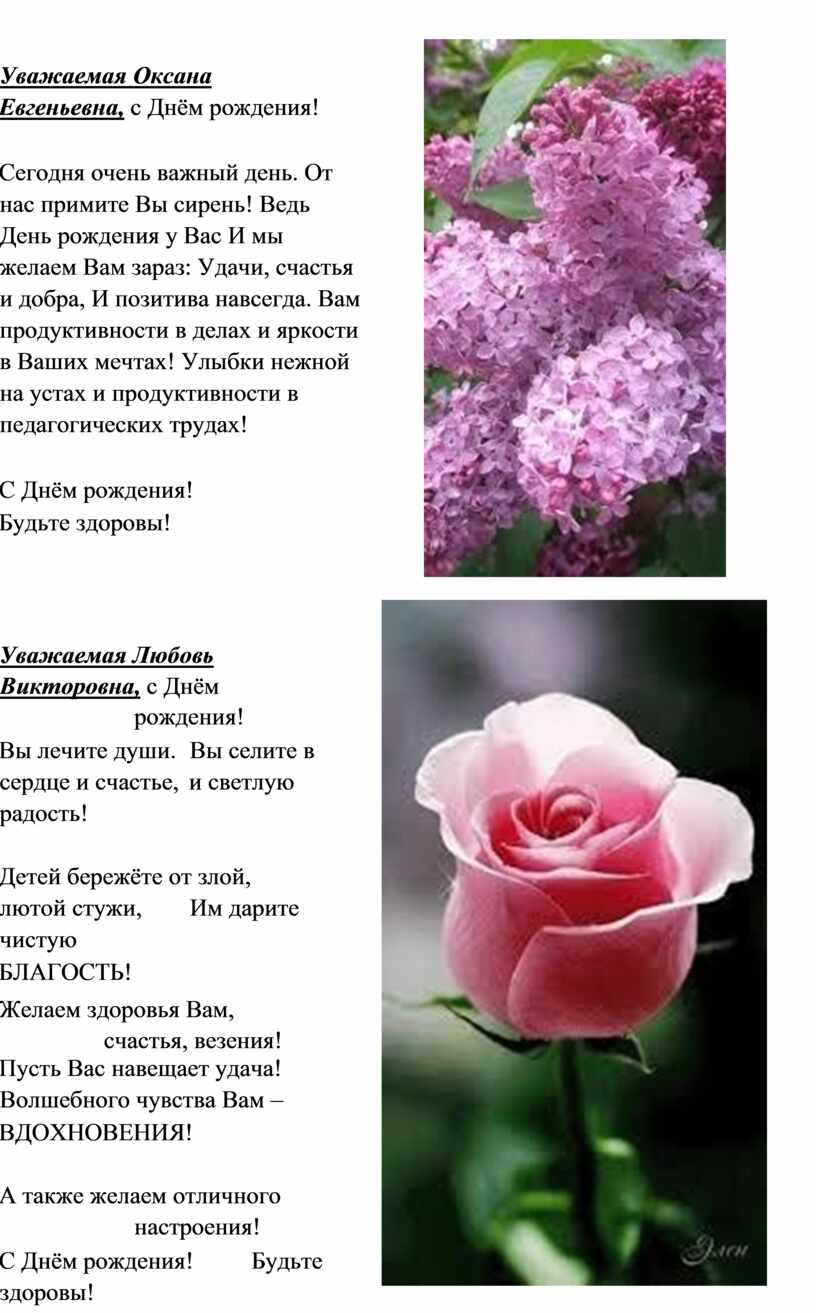 Сегодня очень важный день. От нас примите Вы сирень! Ведь День рождения у Вас И мы желаем Вам зараз: Удачи, счастья и добра, И позитива навсегда. Вам продуктивности в делах и яркости в Ваших мечтах! Улыбки нежной на устах и продуктивности в педагогических трудах!