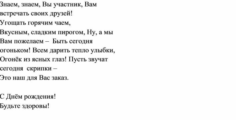 Вкусным, сладким пирогом, Ну, а мы Вам пожелаем – Быть сегодня огоньком! Всем дарить тепло улыбки, Огонёк из ясных глаз! Пусть звучат сегодня скрипки –
