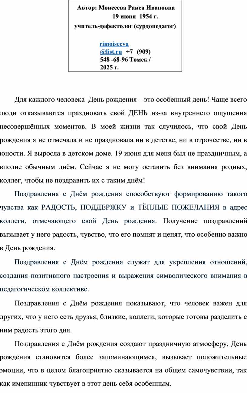Автор: Моисеева Раиса Ивановна 19 июня 1954 г. учитель-дефектолог (сурдопедагог) rimoiseeva @list.ru +7 (909) 548 -68-96 Томск / 2025 г. |