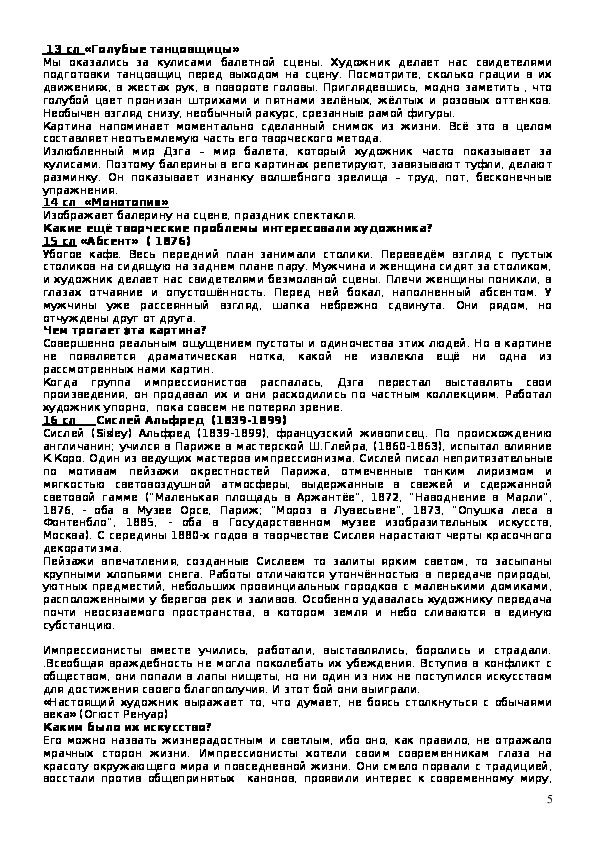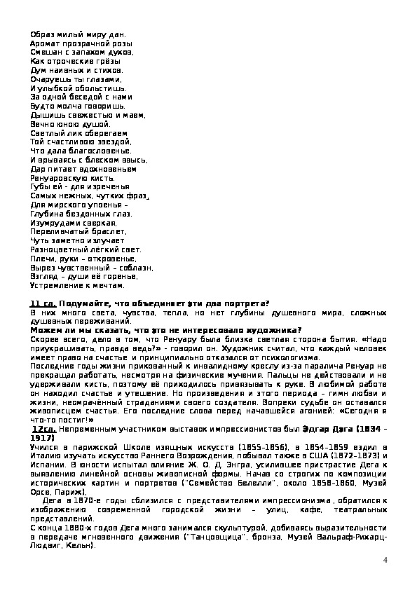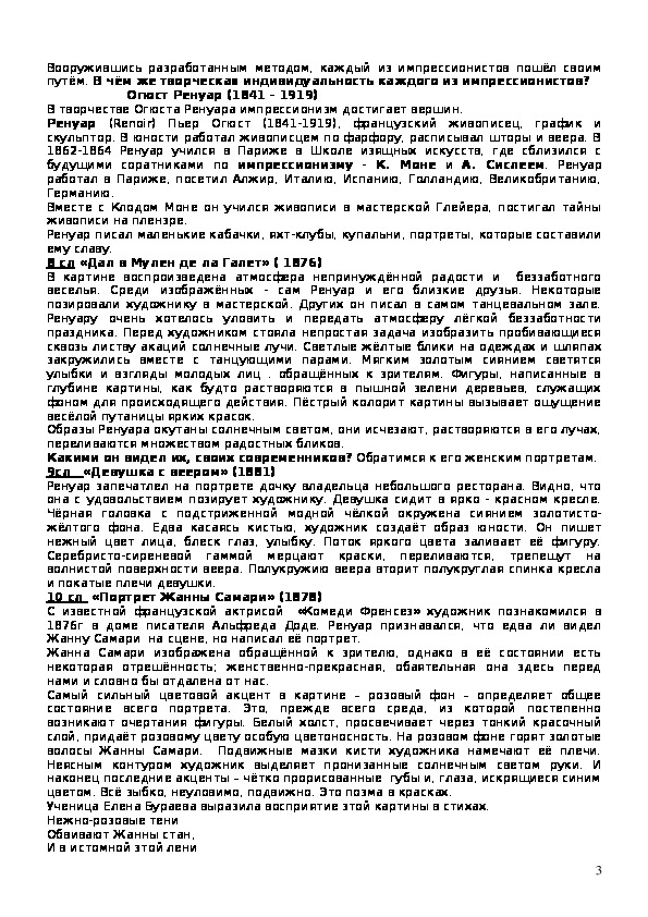 Цель: познакомить учащихся с творческими принципами импрессионистов, с их стремлением раскрыть средствами живописи взаимосвязь человека и окружающей среды, показать красоту природы, научить людей ценить её, обратить внимание учащихся на новую технику письма импрессионистов на примере работ Э.Мане, К. Моне, Э. Дега, О. Ренуара.