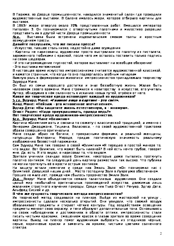Цель: познакомить учащихся с творческими принципами импрессионистов, с их