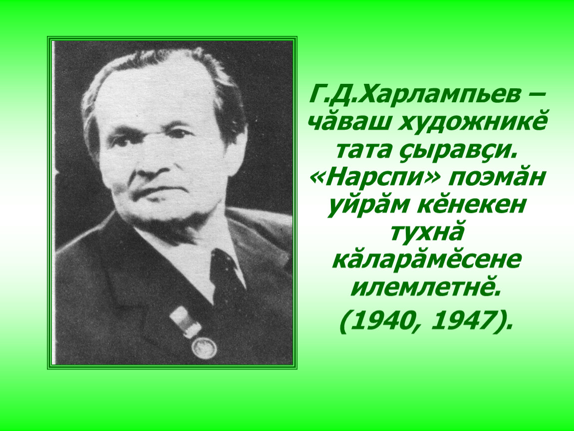 Г.Д.Харлампьев – чăваш художникĕ тата çыравçи. «Нарспи» поэмăн уйрăм кĕнекен тухнă кăларăмĕсене илемлетнĕ.
