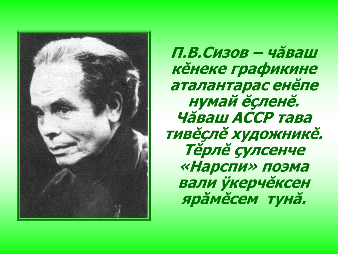 П.В.Сизов – чăваш кĕнеке графикине аталантарас енĕпе нумай ĕçленĕ. Чăваш АССР тава тивĕçлĕ художникĕ. Тĕрлĕ çулсенче «Нарспи» поэма вали ÿкерчĕксен ярăмĕсем тунă.