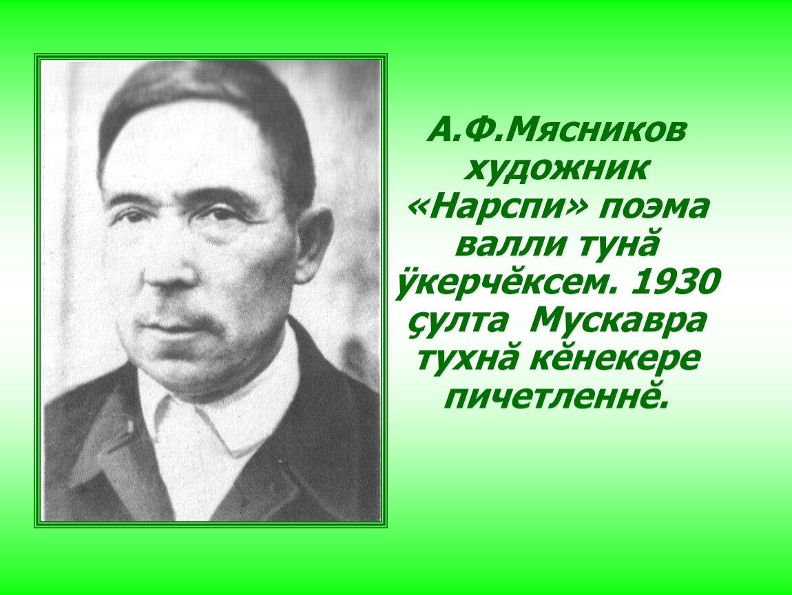 А.Ф.Мясников художник «Нарспи» поэма валли тунă ÿкерчĕксем. 1930 çулта Мускавра тухнă кĕнекере пичетленнĕ.