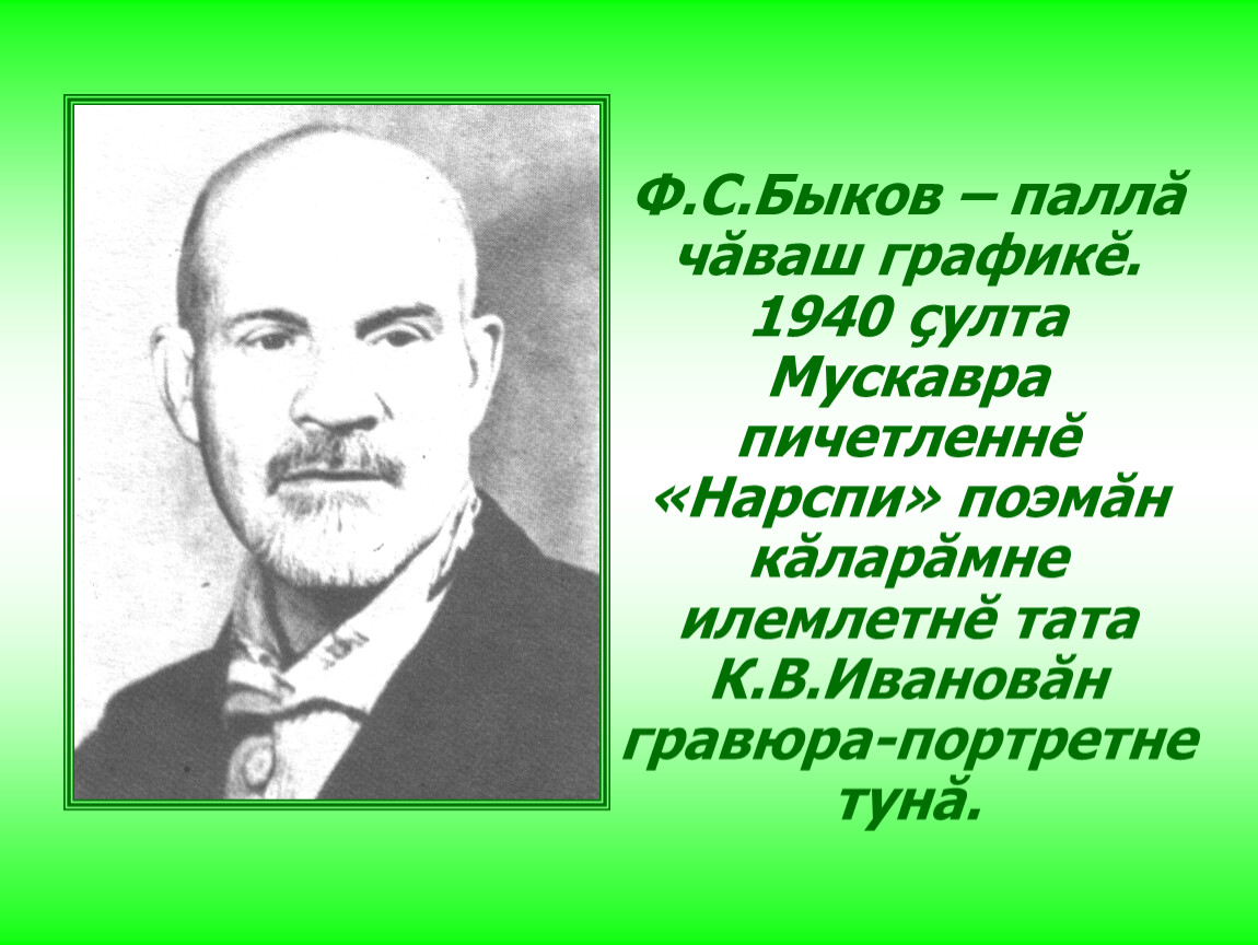 Ф.С.Быков – паллă чăваш графикĕ. 1940 çулта Мускавра пичетленнĕ «Нарспи» поэмăн кăларăмне илемлетнĕ тата К.В.Ивановăн гравюра-портретне тунă.