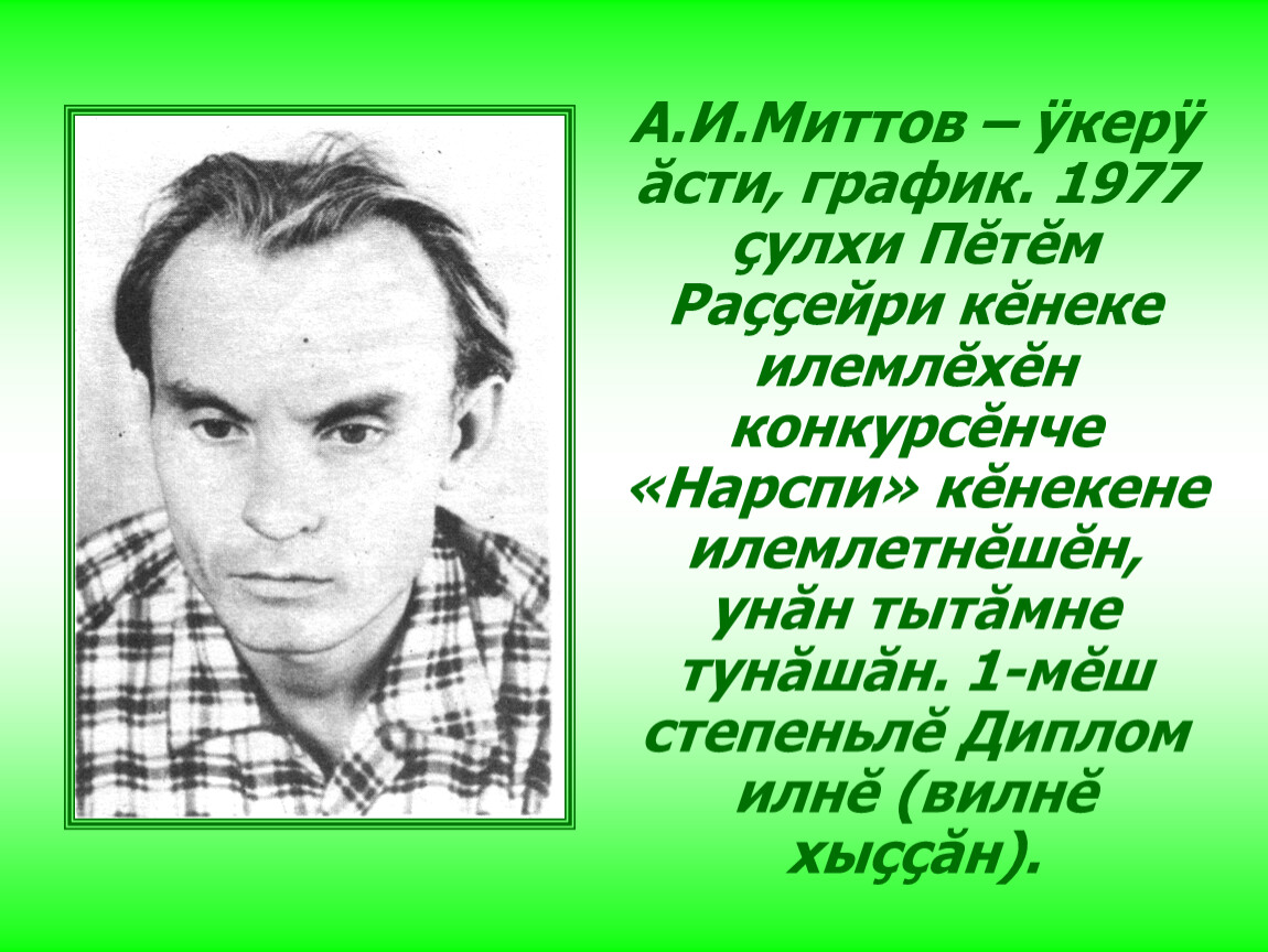 А.И.Миттов – ÿкерÿ ăсти, график. 1977 çулхи Пĕтĕм Раççейри кĕнеке илемлĕхĕн конкурсĕнче «Нарспи» кĕнекене илемлетнĕшĕн, унăн тытăмне тунăшăн. 1-мĕш степеньлĕ Диплом илнĕ (вилнĕ хыççăн).