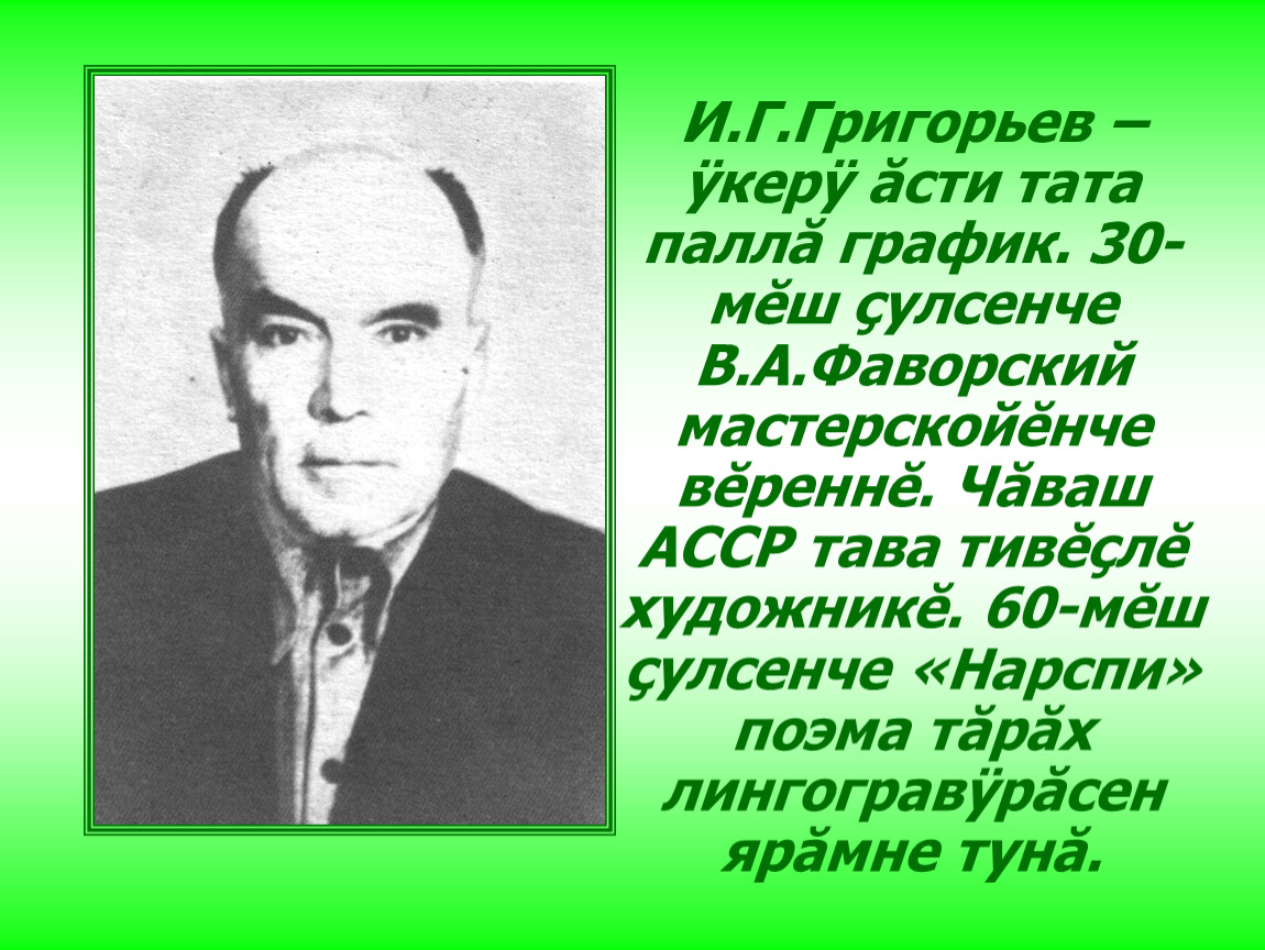 И.Г.Григорьев – ÿкерÿ ăсти тата паллă график. 30-мĕш çулсенче В.А.Фаворский мастерскойĕнче вĕреннĕ. Чăваш АССР тава тивĕçлĕ художникĕ. 60-мĕш çулсенче «Нарспи» поэма тăрăх лингогравÿрăсен ярăмне тунă.