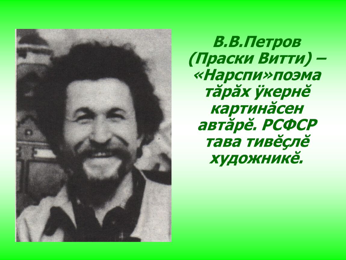 В.В.Петров (Праски Витти) – «Нарспи»поэма тăрăх ÿкернĕ картинăсен автăрĕ. РСФСР тава тивĕçлĕ художникĕ.