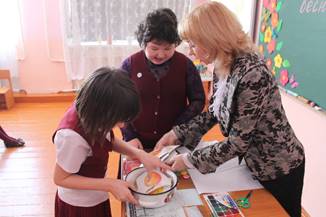 7. Урок ИЗО -раскрасить цветок, кисть привязана к руке.
