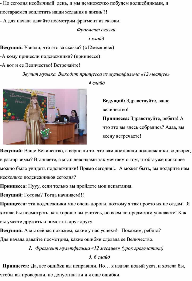 Принцесса: Здравствуйте, ребята! А что это вы здесь собрались? Аааа, вы весну встречаете!