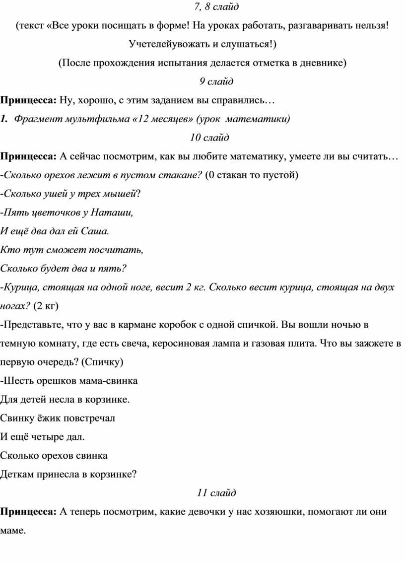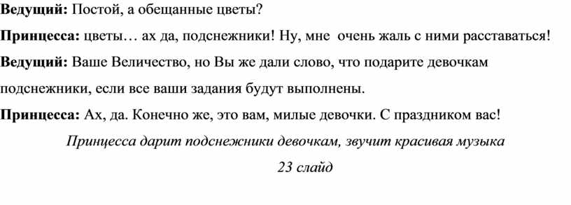 Принцесса: эти подснежники мне очень дороги, поэтому я так просто их не отдам! Я хотела бы посмотреть, как хорошо вы учитесь, по всем ли предметам успеваете! Как вы умеете дружить и помогать друг другу.