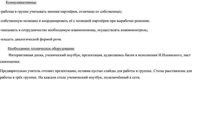 Интерактивная доска, ученический ноутбук, презентация, аудиозапись басни в исполнении И.Ильинского, лист самооценки.