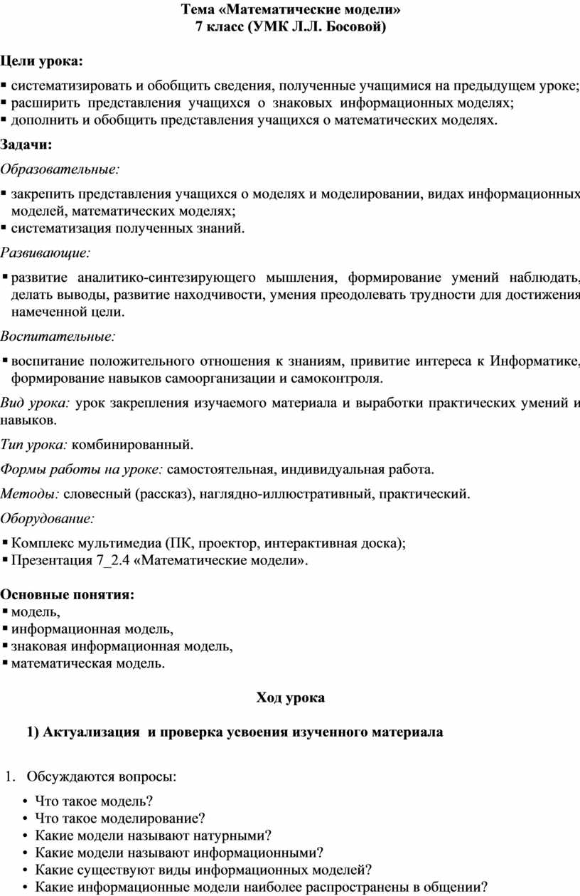 (Сопровождается показом презентации 7_2.4_Математические модели»)