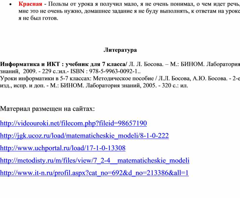 1. Информатика и ИКТ : учебник для 7 класса/ Л. Л. Босова. – М.: БИНОМ. Лаборатория знаний, 2009. - 229 с.:ил.- ISBN : 978-5-9963-0092-1..