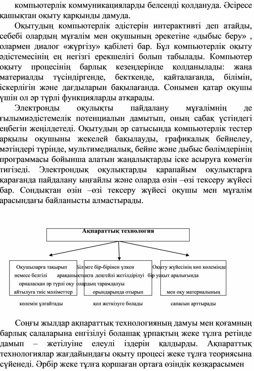 Жаңа ақпараттық технологияларды пайдалану – педагогикалық іс-әрекеттердің мазмұны мен формасын толықтыру негізінде оқыту үрдісін жетілдірудің бірден бір жолы. Компьютерлік желілерді, интернет жүйесін, электрондық оқулықтарды, мультимедиалық технологияларды, қашықтан оқыту технологиясын пайдалану оқу орындарында ақпаратты-коммуникациялық технологиялар кеңістігін құруға жағдай жасайды.