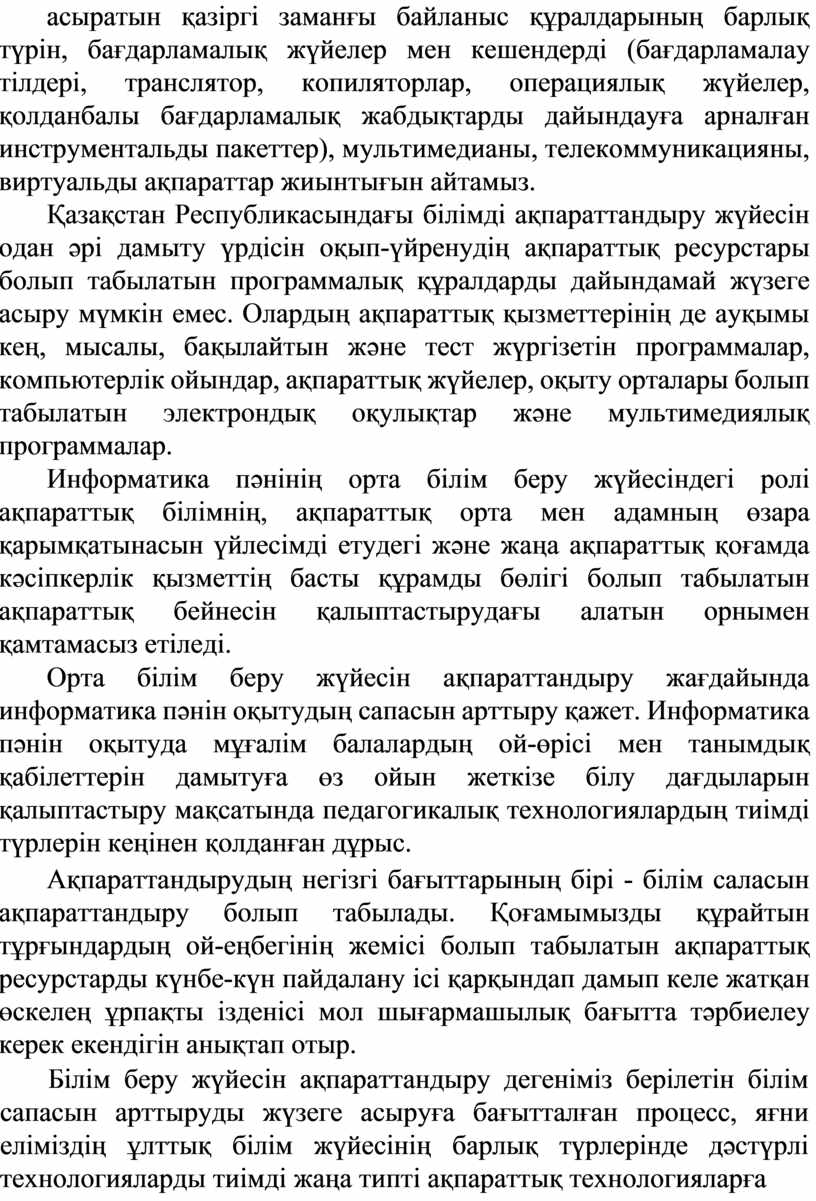 Ақпараттандырудың негізгі бағыттарының бірі - білім саласын ақпараттандыру болып табылады. Қоғамымызды құрайтын тұрғындардың ой-еңбегінің жемісі болып табылатын ақпараттық ресурстарды күнбе-күн пайдалану ісі қарқындап дамып келе жатқан өскелең ұрпақты ізденісі мол шығармашылық бағытта тәрбиелеу керек екендігін анықтап отыр.