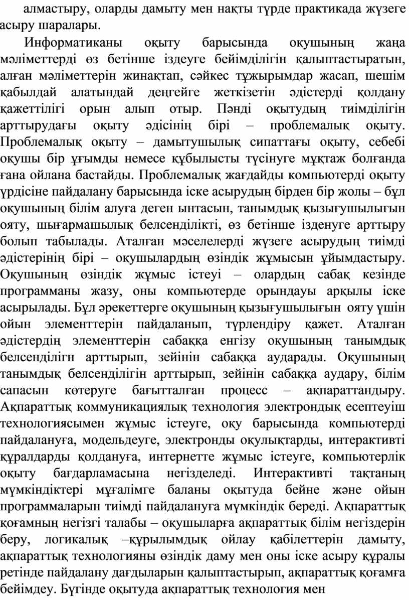 Информатиканы оқыту барысында оқушының жаңа мәліметтерді өз бетінше іздеуге бейімділігін қалыптастыратын, алған мәліметтерін жинақтап, сәйкес тұжырымдар жасап, шешім қабылдай алатындай деңгейге жеткізетін әдістерді қолдану қажеттілігі орын алып отыр. Пәнді оқытудың тиімділігін арттырудағы оқыту әдісінің бірі – проблемалық оқыту. Проблемалық оқыту – дамытушылық сипаттағы оқыту, себебі оқушы бір ұғымды немесе құбылысты түсінуге мұқтаж болғанда ғана ойлана бастайды. Проблемалық жағдайды компьютерді оқыту үрдісіне пайдалану барысында іске асырудың бірден бір жолы – бұл оқушының білім алуға деген ынтасын, танымдық қызығушылығын ояту, шығармашылық белсенділікті, өз бетінше ізденуге арттыру болып табылады. Аталған мәселелерді жүзеге асырудың тиімді әдістерінің бірі – оқушылардың өзіндік жұмысын ұйымдастыру. Оқушының өзіндік жұмыс істеуі – олардың сабақ кезінде программаны жазу, оны компьютерде орындауы арқылы іске асырылады. Бұл әрекеттерге оқушының қызығушылығын ояту үшін ойын элементтерін пайдаланып, түрлендіру қажет. Аталған әдістердің элементтерін сабаққа енгізу оқушының танымдық белсенділігн арттырып, зейінін сабаққа аударады. Оқушының танымдық белсенділігін арттырып, зейінін сабаққа аудару, білім сапасын көтеруге бағытталған процесс – ақпараттандыру. Ақпараттық коммуникациялық технология электрондық есептеуіш технологиясымен жұмыс істеуге, оқу барысында компьютерді пайдалануға, модельдеуге, электронды оқулықтарды, интерактивті құралдарды қолдануға, интернетте жұмыс істеуге, компьютерлік оқыту бағдарламасына негізделеді. Интерактивті тақтаның мүмкіндіктері мұғалімге баланы оқытуда бейне және ойын программаларын тиімді пайдалануға мүмкіндік береді. Ақпараттық қоғамның негізгі талабы – оқушыларға ақпараттық білім негіздерін беру, логикалық –құрылымдық ойлау қабілеттерін дамыту, ақпараттық технологияны өзіндік даму мен оны іске асыру құралы ретінде пайдалану дағдыларын қалыптастырып, ақпараттық қоғамға бейімдеу. Бүгінде оқытуда ақпараттық технология мен компьютерлік коммуникацияларды белсенді қолдануда. Әсіресе қашықтан оқыту қарқынды дамуда.