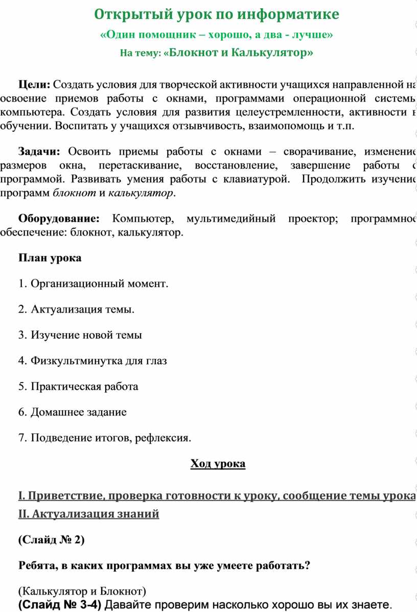 Оборудование: Компьютер, мультимедийный проектор; программное обеспечение: блокнот, калькулятор.