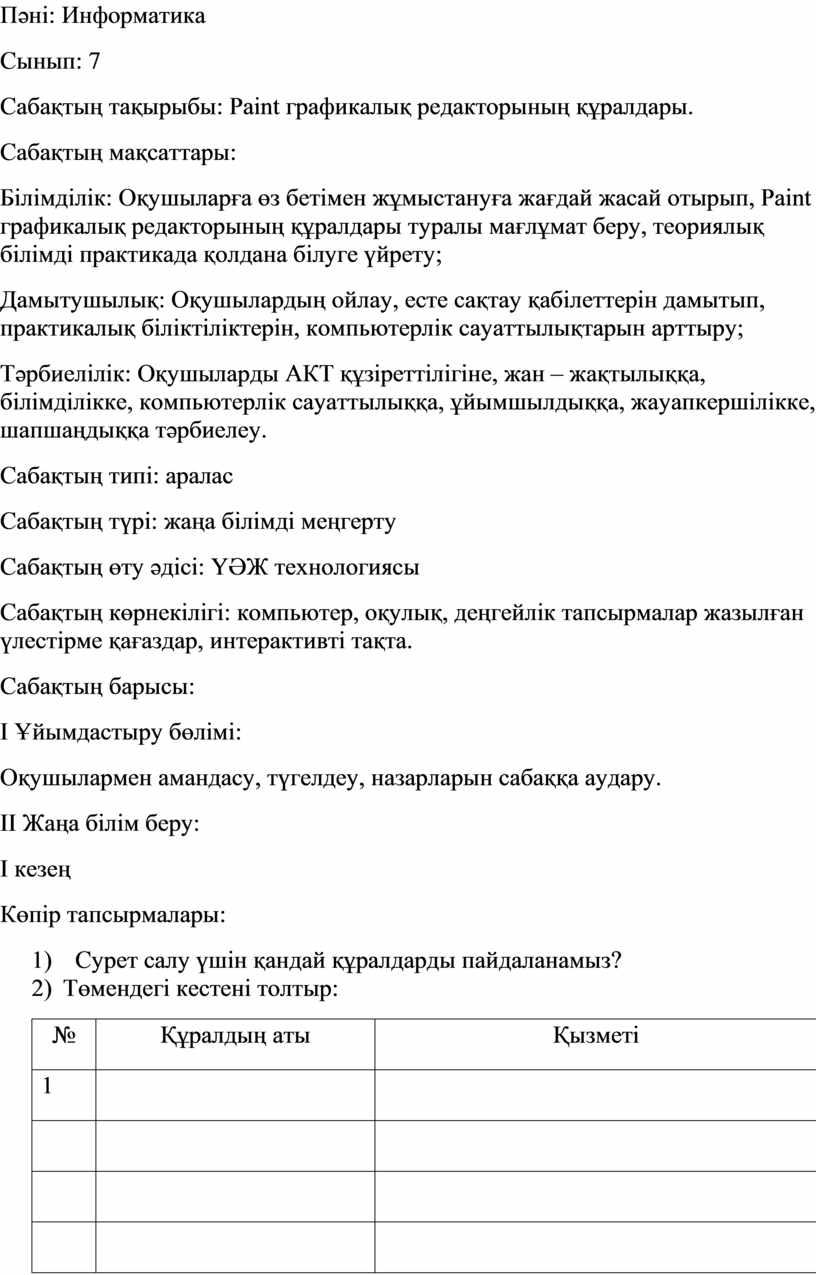 Білімділік: Оқушыларға өз бетімен жұмыстануға жағдай жасай отырып, Paint графикалық редакторының құралдары туралы мағлұмат беру, теориялық білімді практикада қолдана білуге үйрету;