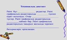 Ø Ұй жұмысын толық орындады; Ø Құрал саймандарды толық біледі; Ø Paint графикалық редакторында жұмыс істеи біледі; Ø Деңгейлік тапсырмаларты толық орындады; Ø Техникалық диктантты дұрыс жазды. |