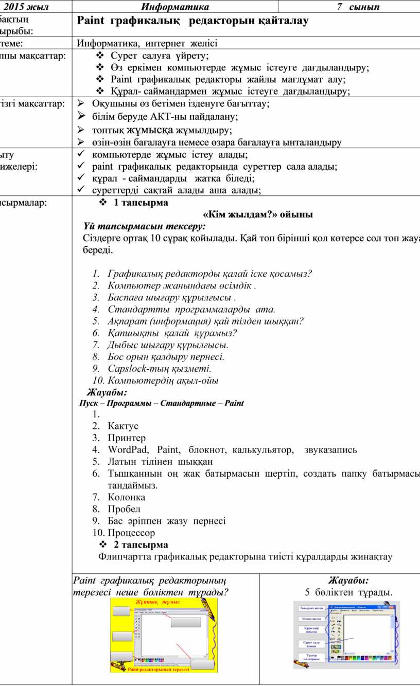 “Paint графиктік редакторы” тақырыптарын оқып, мазмұндау. Құралдардың міндетін жаттау. |