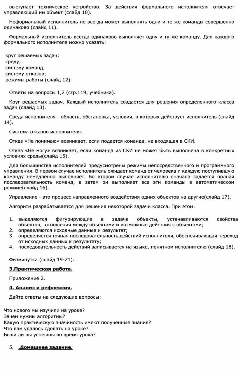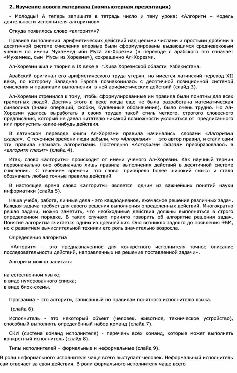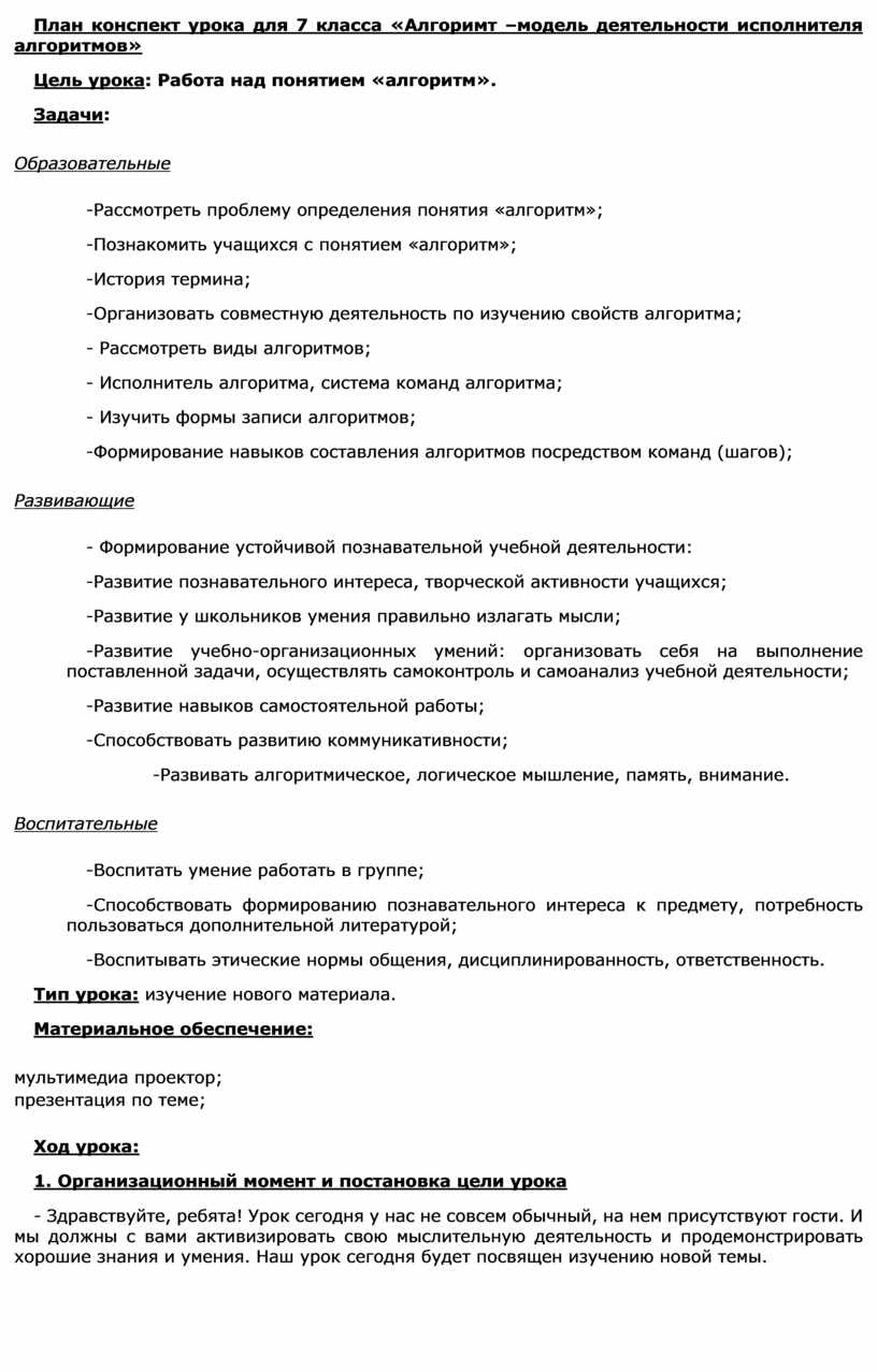 План конспект урока для 7 класса «Алгоримт –модель деятельности исполнителя алгоритмов»