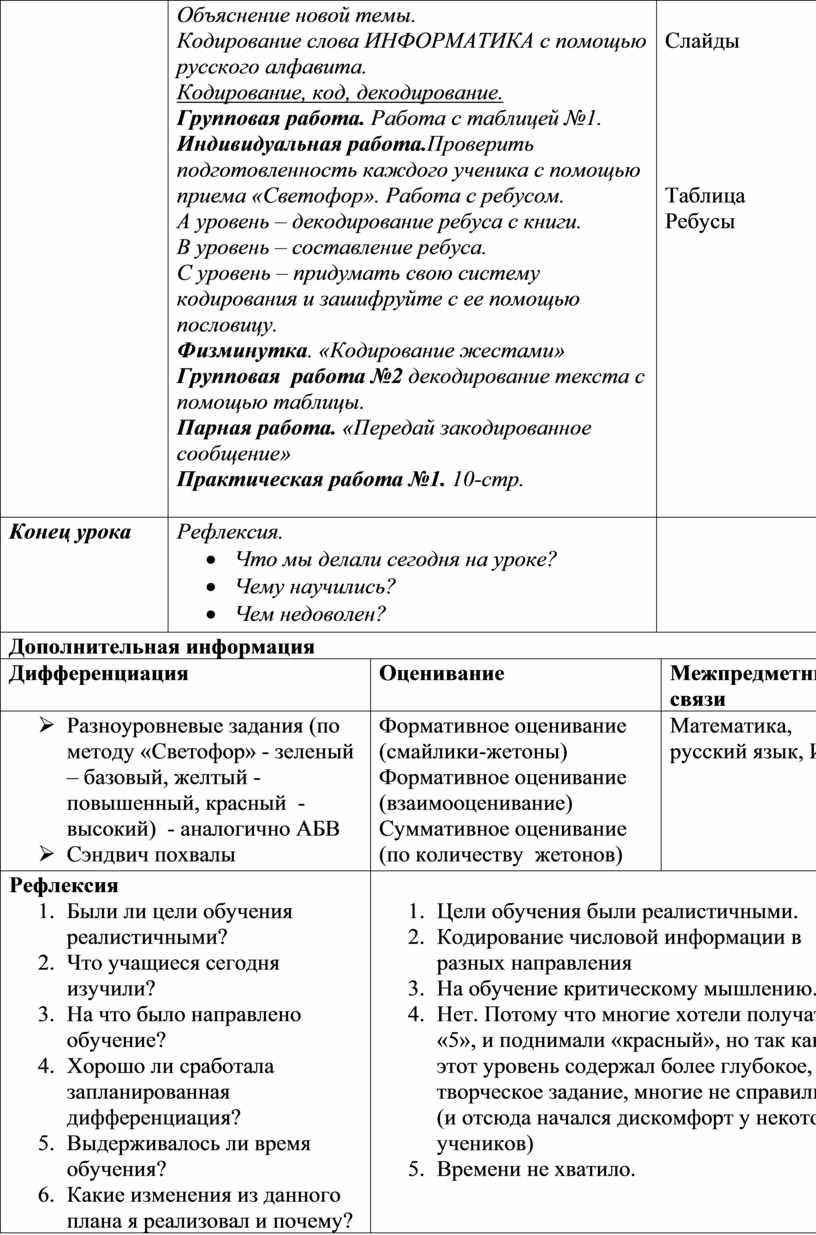 Объяснение новой темы. Кодирование слова ИНФОРМАТИКА с помощью русского алфавита. Кодирование, код, декодирование. Групповая работа. Работа с таблицей №1. Индивидуальная работа.Проверить подготовленность каждого ученика с помощью приема «Светофор». Работа с ребусом. А уровень – декодирование ребуса с книги. В уровень – составление ребуса. С уровень – придумать свою систему кодирования и зашифруйте с ее помощью пословицу. Физминутка. «Кодирование жестами» Групповая работа №2 декодирование текста с помощью таблицы. Парная работа. «Передай закодированное сообщение» Практическая работа №1. 10-стр.