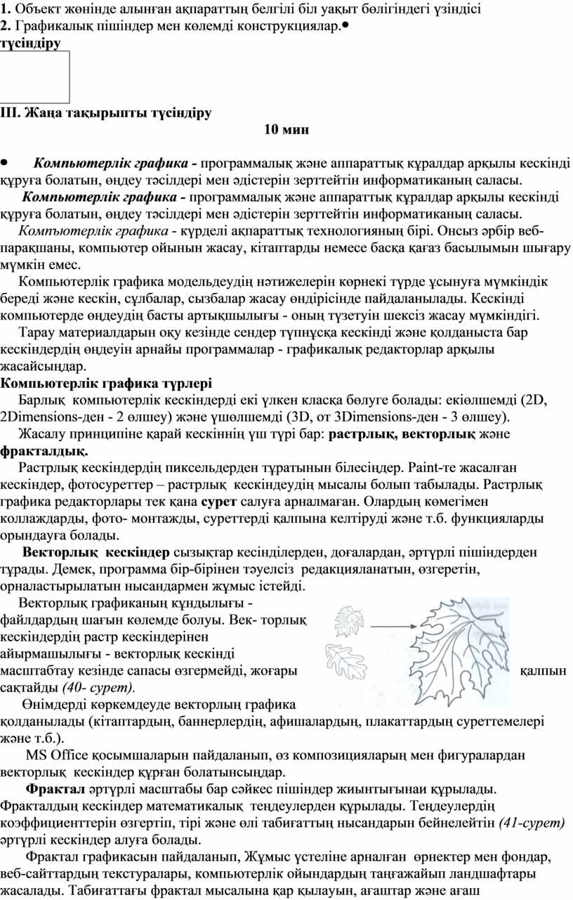 Компьютерлік графика - программалық және аппараттық кұралдар арқылы кескінді құруға болатын, өңдеу тәсілдері мен әдістерін зерттейтін информатиканың саласы. Компъютерлік графика - күрделі ақпараттық технологияның бірі. Онсыз әрбір веб-парақшаны, компьютер ойынын жасау, кітаптарды немесе басқа қағаз басылымын шығару мүмкін емес. Компьютерлік графика модельдеудің нәтижелерін көрнекі түрде ұсынуға мүмкіндік береді және кескін, сұлбалар, сызбалар жасау өндірісінде пайдаланылады. Кескінді компьютерде өңдеудің басты артықшылығы - оның түзетуін шексіз жасау мүмкіндігі. Тарау материалдарын оқу кезінде сендер түпнұсқа кескінді және қолданыста бар кескіндердің өңдеуін арнайы программалар - графикалық редакторлар арқылы жасайсыңдар. Компьютерлік графика түрлері Барлық компьютерлік кескіндерді екі үлкен класқа бөлуге болады: екіөлшемді (2D, 2Dimensions-ден - 2 өлшеу) және үшөлшемді (3D, от 3Dimensions-ден - 3 өлшеу). Жасалу принципіне қарай кескіннің үш түрі бар: растрлық, векторлық және фракталдық. Растрлық кескіндердің пиксельдерден тұратынын білесіңдер. Paint-те жасалған кескіндер, фотосуреттер – растрлық кескіндеудің мысалы болып табылады. Растрлық графика редакторлары тек қана сурет салуға арналмаған. Олардың көмегімен коллаждарды, фото- монтажды, суреттерді қалпына келтіруді және т.б. функцияларды орындауға болады. Векторлық кескіндер сызықтар кесінділерден, доғалардан, әртүрлі пішіндерден тұрады. Демек, программа бір-бірінен тәуелсіз редакцияланатын, өзгеретін, орналастырылатын нысандармен жұмыс істейді. Векторлық графиканың кұндылығы - файлдардың шағын көлемде болуы. Век- торлық кескіндердің растр кескіндерінен айырмашылығы - векторлық кескінді масштабтау кезінде сапасы өзгермейді, жоғары қалпын сақтайды (40- сурет). Өнімдерді көркемдеуде векторлың графика қолданы MS Office қосымшаларын пайдаланып, өз композицияларың мен фигуралардан векторлық кескіндер құрған болатынсыңдар. Фрактал әртүрлі масштабы бар сәйкес пішіндер жиынтығынаи құрылады. Фракталдың кескіндер математикалық теңдеулерден құрылады. Теңдеулердің коэффициенттерін өзгертіп, тірі және өлі табиғаттың нысандарын бейнелейтін (41-сурет) әртүрлі кескіндер алуға болады. Фрактал графикасын пайдаланып, Жұмыс үстеліне арналған өрнектер мен фондар, веб-сайттардың текстуралары, компьютерлік ойындардың таңғажайып ландшафтары жасалады. Табиғаттағы фрактал мысалына қар қылауын, ағаштар және ағаш жапырақтарын, адамның қан жүру жүйесін жатқызуға болады. 42-суретте оның компьютерлік моделі берілген.