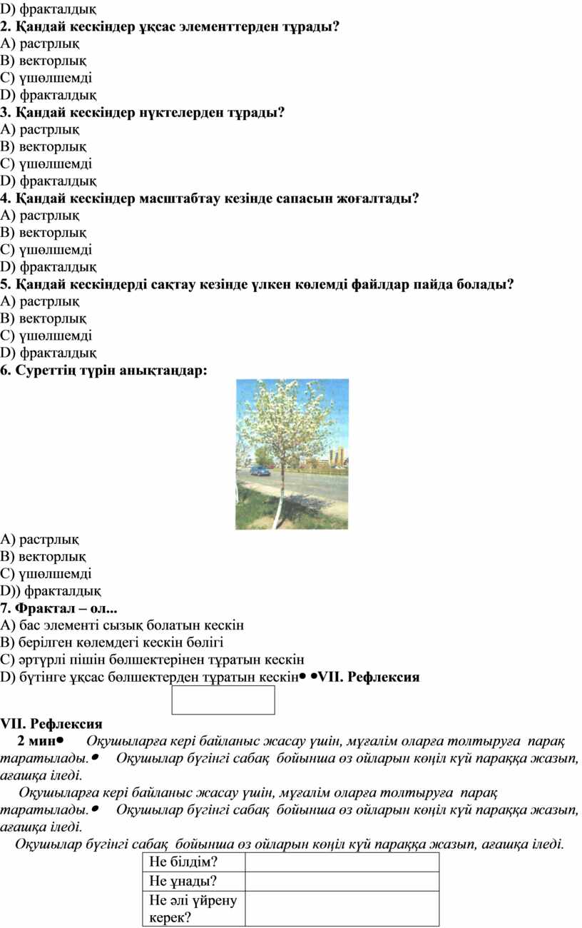 Өзіңді тексер! 1. Қандай кескіндер шынайы? А) растрлық В) векторлық С) үшөлшемді D) фракталдық 2. Қандай кескіндер ұқсас элементтерден тұрады? A) растрлық B) векторлық C) үшөлшемді D) фракталдық 3. Қандай кескіндер нүктелерден тұрады? A) растрлық B) векторлық C) үшөлшемді D) фракталдық 4. Қандай кескіндер масштабтау кезінде сапасын жоғалтады? A) растрлық B) векторлық C) үшөлшемді D) фракталдық 5. Қандай кескіндерді сақтау кезінде үлкен көлемді файлдар пайда болады? A) растрлық B) векторлық C) үшөлшемді D) фракталдық 6. Суреттің түрін анықтаңдар: