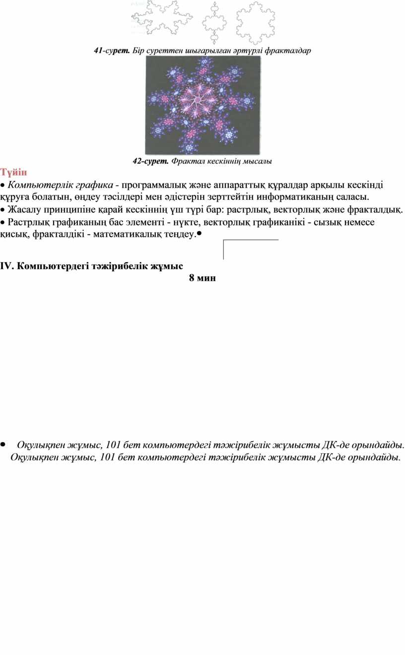 Компьютердегі тәжірибелік жұмыс 1. Графикалық Paint редакторын, MS PowerPoint және фрактал генераторын қолданып, сурет салыңдар (43-сурет). 2. Әр программада сурет аумағын өзгертіп, шығарылған кескіндердің сапасын салыстырыңдар. 3.