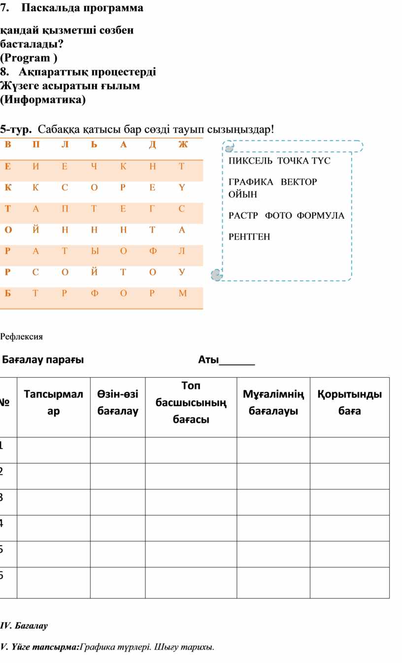 1. Оқушыларды компьютерлік графика ұғымыментаныстыра отырып, графиканың түрлері,редакторлары туралы білімдерін қалыптастыру;