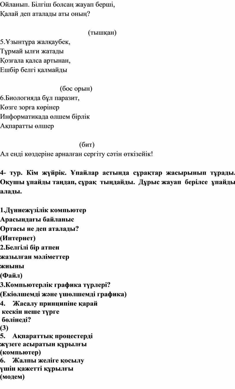 4- тур. Кім жүйрік. Ұпайлар астында сұрақтар жасырынып тұрады. Оқушы ұпайды таңдап, сұрақ тыңдайды. Дұрыс жауап берілсе ұпайды алады.