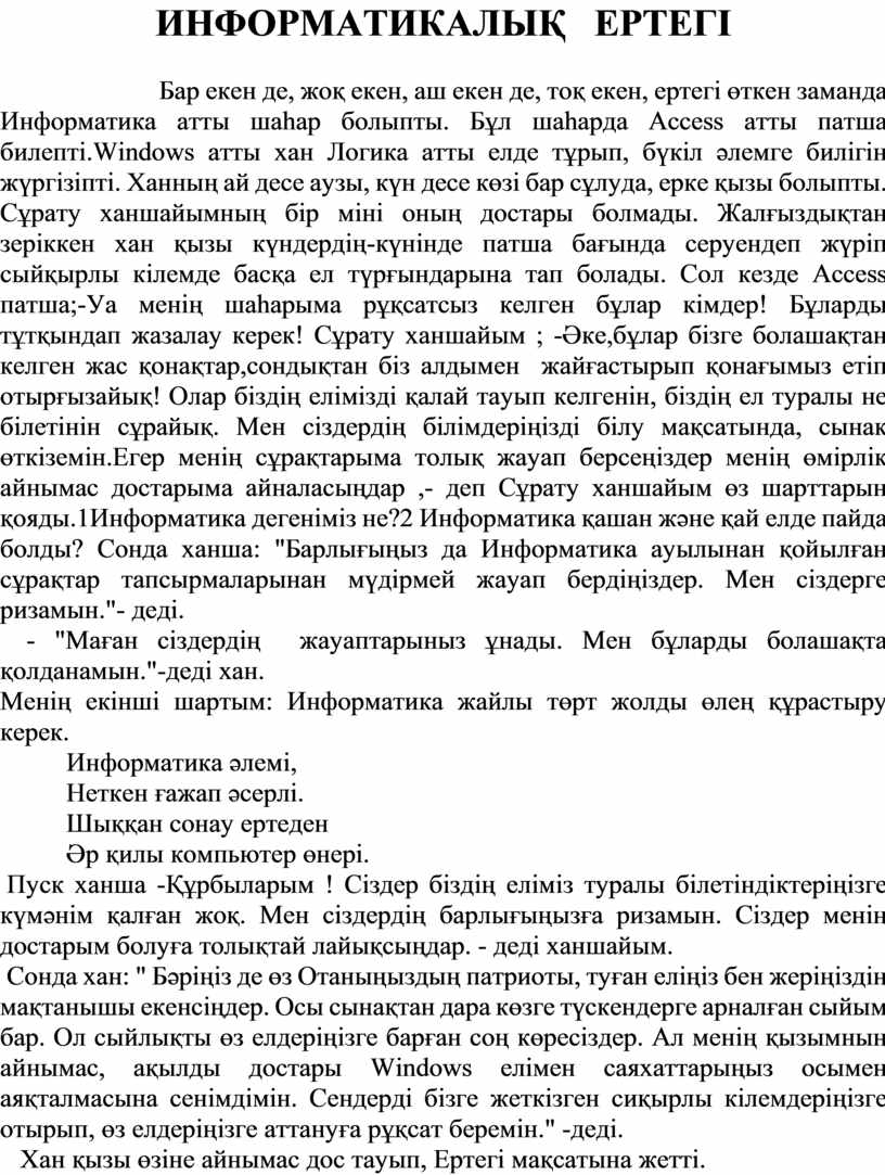 Бар екен де, жоқ екен, аш екен де, тоқ екен, ертегі өткен заманда Информатика атты шаһар болыпты. Бұл шаһарда Access атты патша билепті.Windows атты хан Логика атты елде тұрып, бүкіл әлемге билігін жүргізіпті. Ханның ай десе аузы, күн десе көзі бар сұлуда, ерке қызы болыпты. Сұрату ханшайымның бір міні оның достары болмады. Жалғыздықтан зеріккен хан қызы күндердің-күнінде патша бағында серуендеп жүріп сыйқырлы кілемде басқа ел түрғындарына тап болады. Сол кезде Access патша;-Уа менің шаһарыма рұқсатсыз келген бұлар кімдер! Бұларды тұтқындап жазалау керек! Сұрату ханшайым ; -Әке,бұлар бізге болашақтан келген жас қонақтар,сондықтан біз алдымен жайғастырып қонағымыз етіп отырғызайық! Олар біздің елімізді қалай тауып келгенін, біздің ел туралы не білетінін сұрайық. Мен сіздердің білімдеріңізді білу мақсатында, сынақ өткіземін.Егер менің сұрақтарыма толық жауап берсеңіздер менің өмірлік айнымас достарыма айналасыңдар ,- деп Сұрату ханшайым өз шарттарын қояды.1Информатика дегеніміз не?2 Информатика қашан және қай елде пайда болды? Сонда ханша: "Барлығыңыз да Информатика ауылынан қойылған сұрақтар тапсырмаларынан мүдірмей жауап бердіңіздер. Мен сіздерге ризамын."- деді.