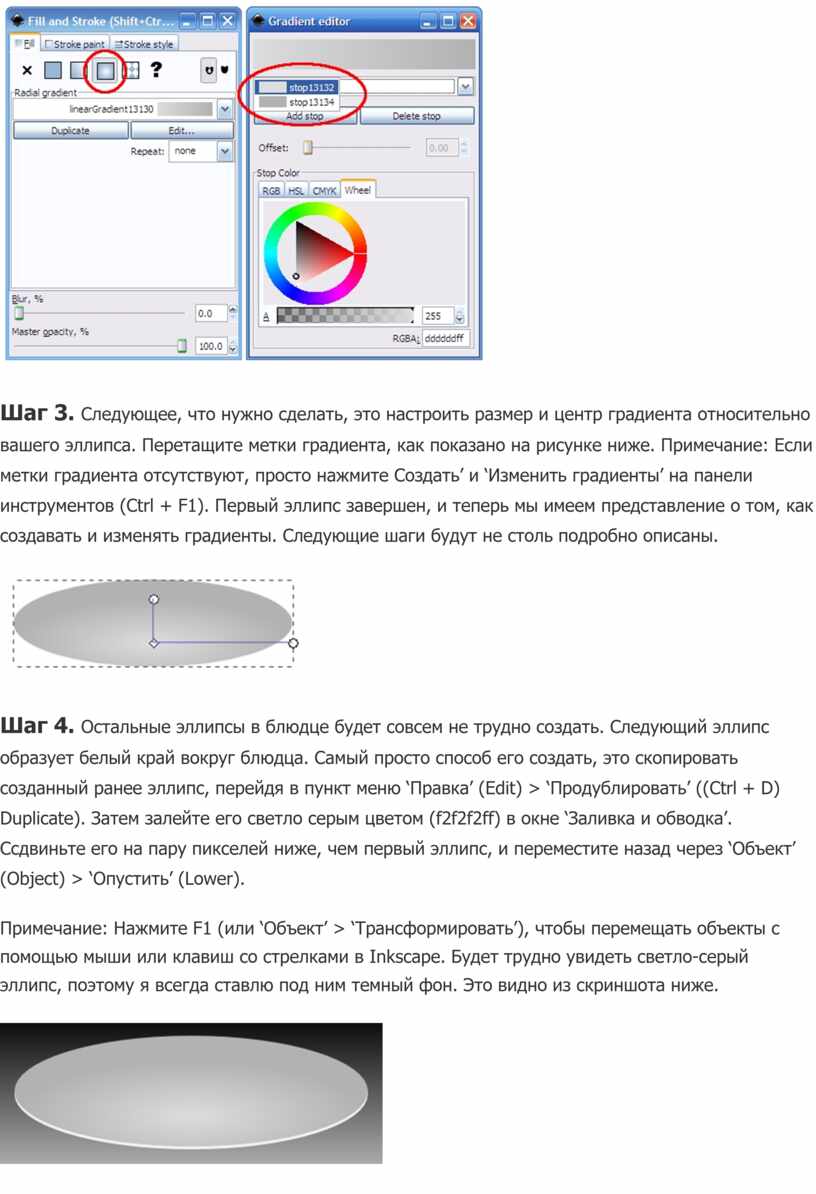 Шаг 4. Остальные эллипсы в блюдце будет совсем не трудно создать. Следующий эллипс образует белый край вокруг блюдца. Самый просто способ его создать, это скопировать созданный ранее эллипс, перейдя в пункт меню ‘Правка’ (Edit) > ‘Продублировать’ ((Ctrl + D) Duplicate). Затем залейте его светло серым цветом (f2f2f2ff) в окне ‘Заливка и обводка’. Ссдвиньте его на пару пикселей ниже, чем первый эллипс, и переместите назад через ‘Объект’ (Object) > ‘Опустить’ (Lower).