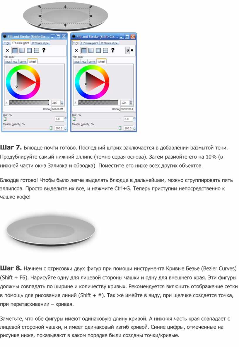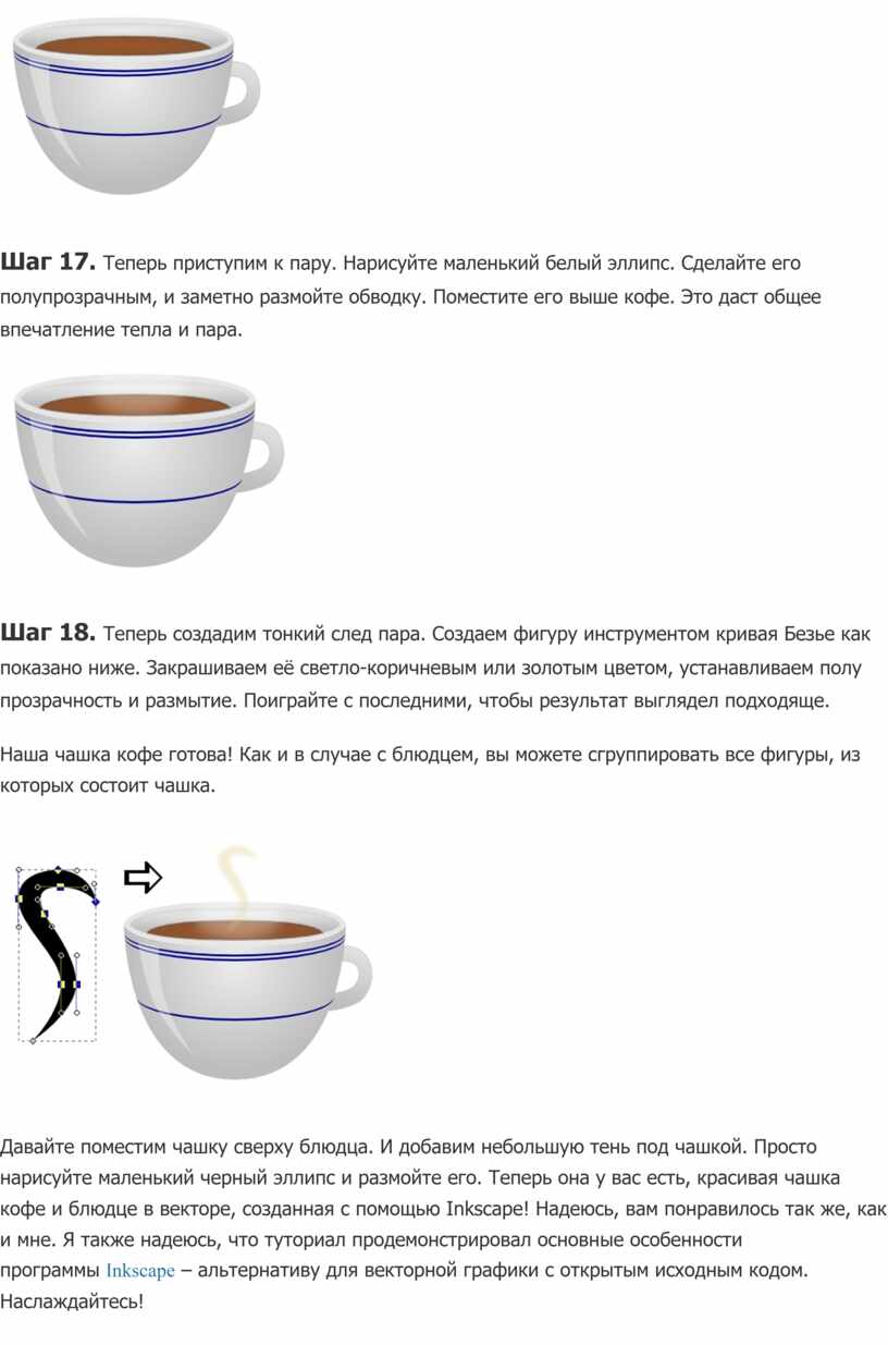 Давайте поместим чашку сверху блюдца. И добавим небольшую тень под чашкой. Просто нарисуйте маленький черный эллипс и размойте его. Теперь она у вас есть, красивая чашка кофе и блюдце в векторе, созданная с помощью Inkscape! Надеюсь, вам понравилось так же, как и мне. Я также надеюсь, что туториал продемонстрировал основные особенности программы Inkscape – альтернативу для векторной графики с открытым исходным кодом. Наслаждайтесь!