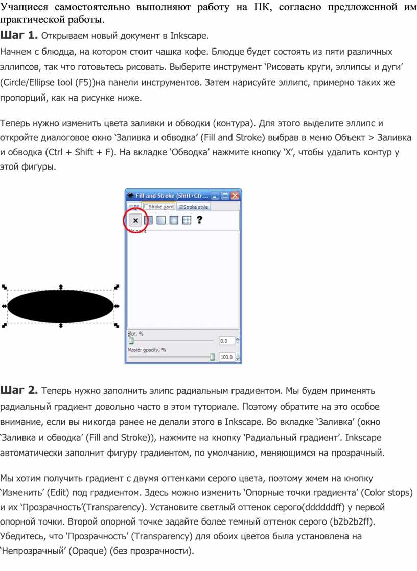Теперь нужно изменить цвета заливки и обводки (контура). Для этого выделите эллипс и откройте диалоговое окно ‘Заливка и обводка’ (Fill and Stroke) выбрав в меню Объект > Заливка и обводка (Ctrl + Shift + F). На вкладке ‘Обводка’ нажмите кнопку ‘X’, чтобы удалить контур у этой фигуры.