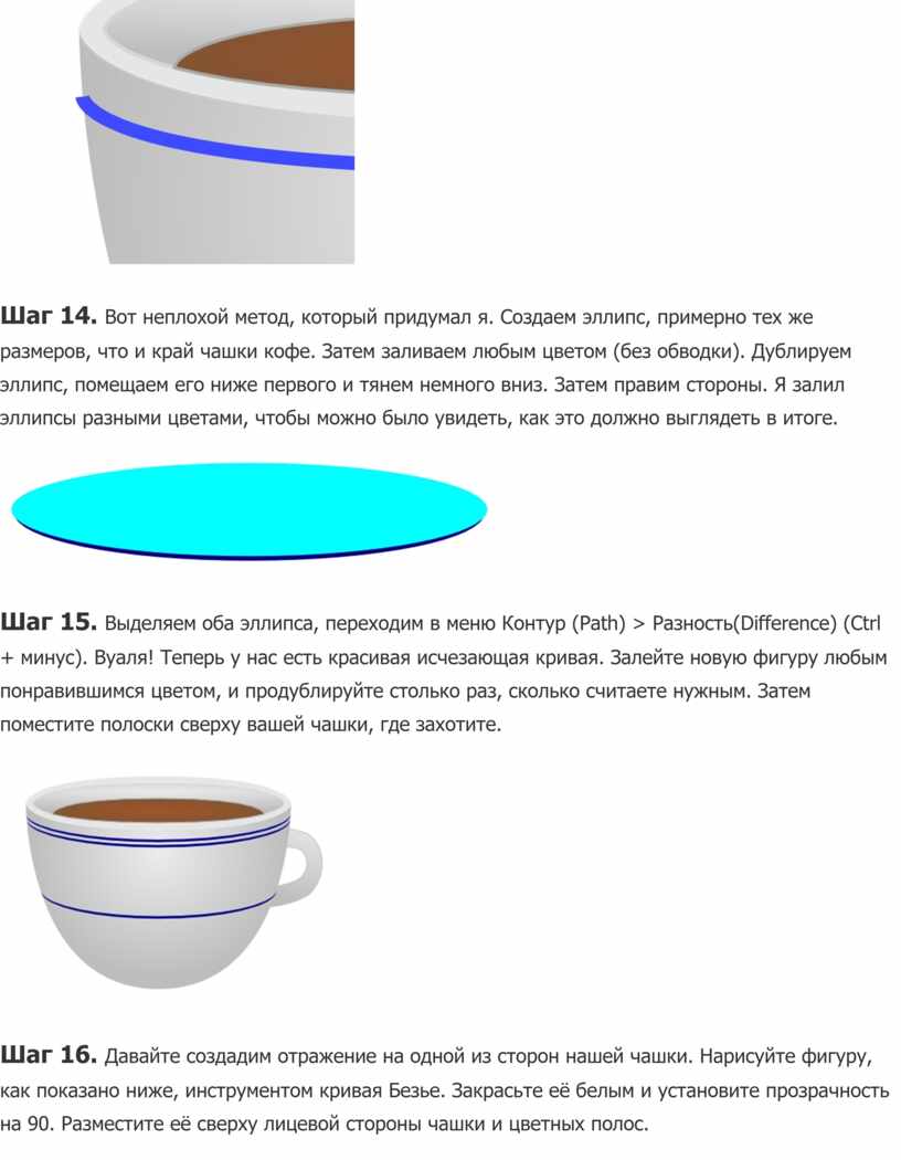 Шаг 15. Выделяем оба эллипса, переходим в меню Контур (Path) > Разность(Difference) (Ctrl + минус). Вуаля! Теперь у нас есть красивая исчезающая кривая. Залейте новую фигуру любым понравившимся цветом, и продублируйте столько раз, сколько считаете нужным. Затем поместите полоски сверху вашей чашки, где захотите.