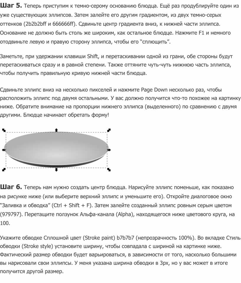 Шаг 5. Теперь приступим к темно-серому основанию блюдца. Ещё раз продублируйте один из уже существующих эллипсов. Затем залейте его другим градиентом, из двух темно-серых оттенков (2b2b2bff и 666666ff). Сдвиньте центр градиента вниз, к нижней части эллипса. Основание не должно быть столь же широким, как остальное блюдце. Нажмите F1 и немного отодвиньте левую и правую сторону эллипса, чтобы его “сплющить”.