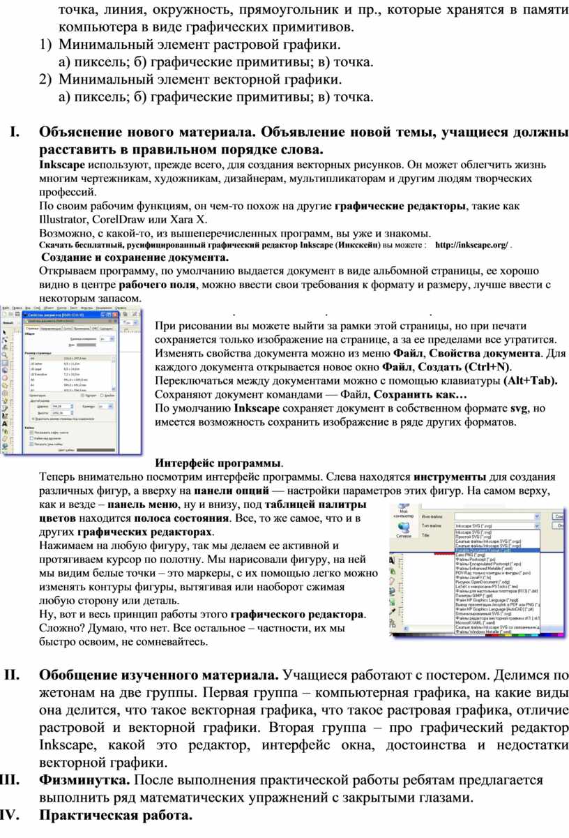 IV. Обобщение изученного материала. Учащиеся работают с постером. Делимся по жетонам на две группы. Первая группа – компьютерная графика, на какие виды она делится, что такое векторная графика, что такое растровая графика, отличие растровой и векторной графики. Вторая группа – про графический редактор Inkscape, какой это редактор, интерфейс окна, достоинства и недостатки векторной графики.