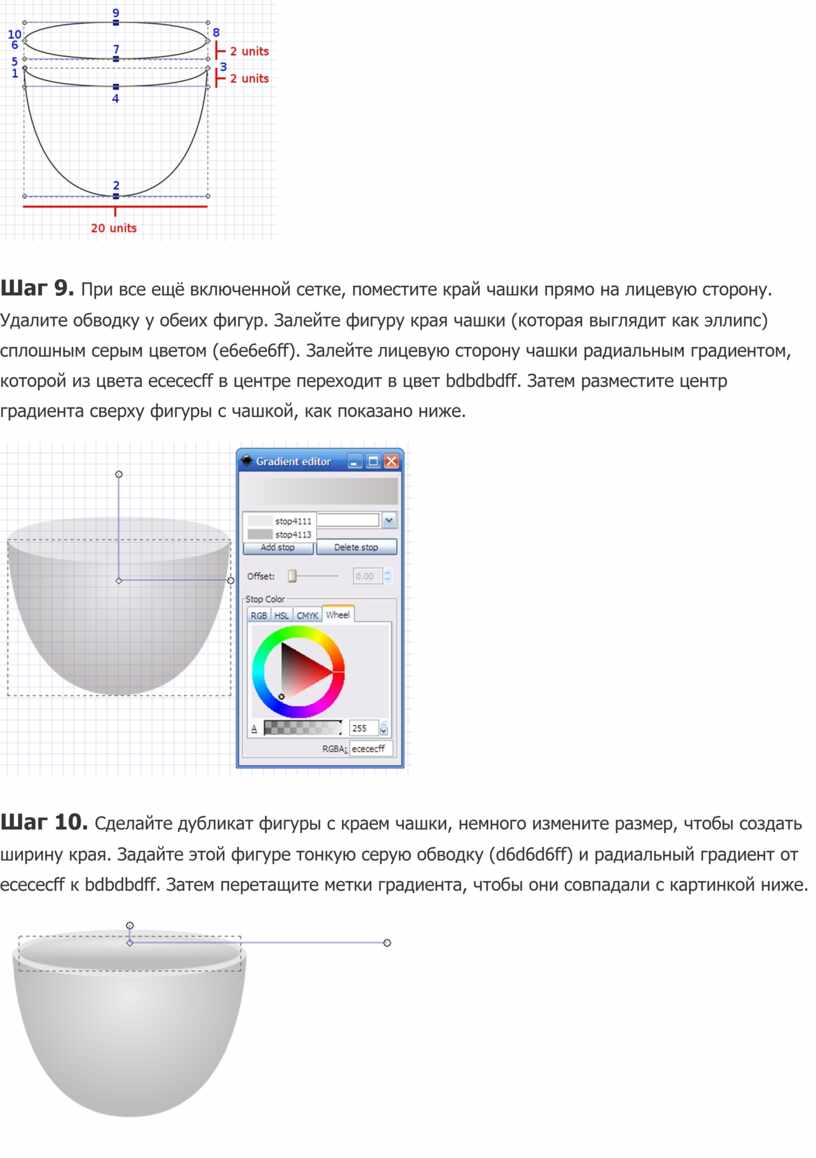 Шаг 10. Сделайте дубликат фигуры с краем чашки, немного измените размер, чтобы создать ширину края. Задайте этой фигуре тонкую серую обводку (d6d6d6ff) и радиальный градиент от ecececff к bdbdbdff. Затем перетащите метки градиента, чтобы они совпадали с картинкой ниже.