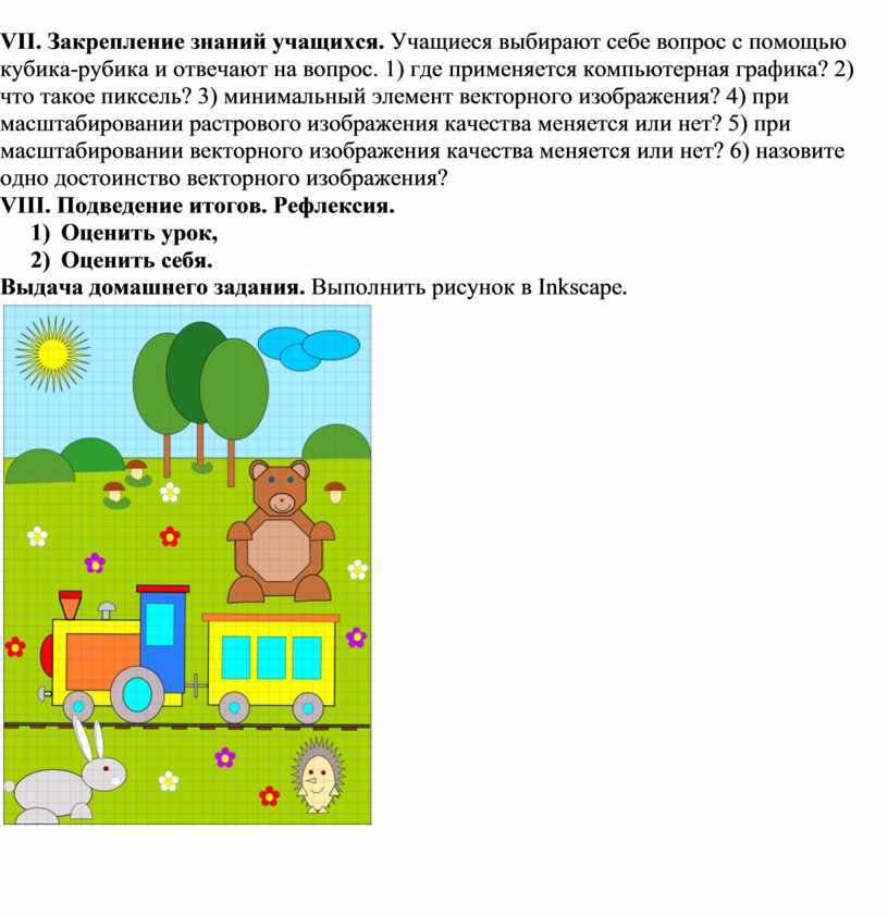 VII. Закрепление знаний учащихся. Учащиеся выбирают себе вопрос с помощью кубика-рубика и отвечают на вопрос. 1) где применяется компьютерная графика? 2) что такое пиксель? 3) минимальный элемент векторного изображения? 4) при масштабировании растрового изображения качества меняется или нет? 5) при масштабировании векторного изображения качества меняется или нет? 6) назовите одно достоинство векторного изображения?