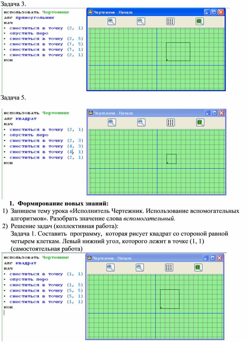 1. Закрепить представления учащихся об исполнителях алгоритмов; научить учащихся управлять исполнителем Чертежник с использованием вспомогательных алгоритмов.