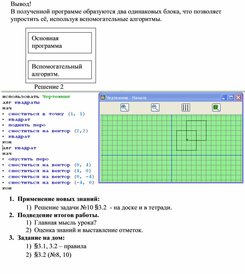 1) Запишем тему урока «Исполнитель Чертежник. Использование вспомогательных алгоритмов». Разобрать значение слова вспомогательный.