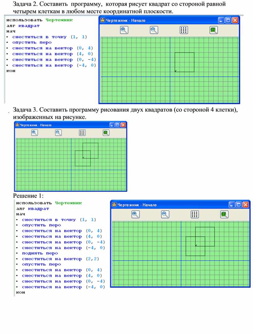 Задача 2. Составить программу, которая рисует квадрат со стороной равной четырем клеткам в любом месте координатной плоскости.
