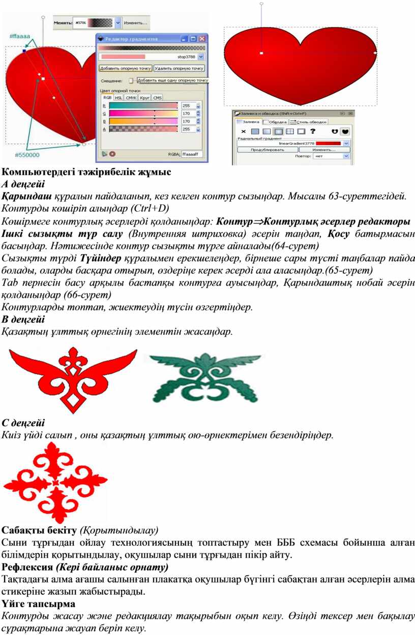 Құйып бояу мен жиектеу (Заливка и обводка) сұхбатын ашыңдар және алынған жүректің контурын градиентпен қойыңдар.