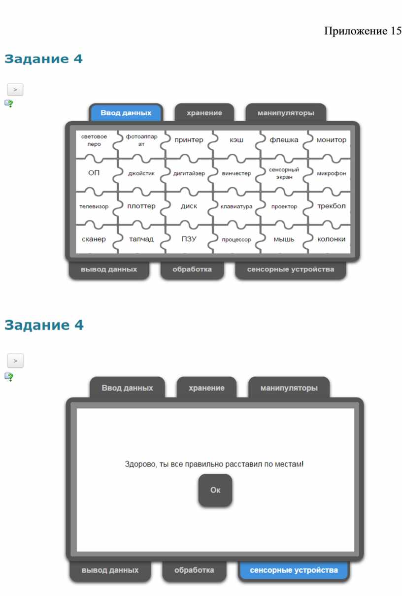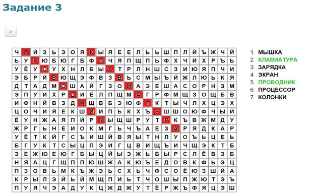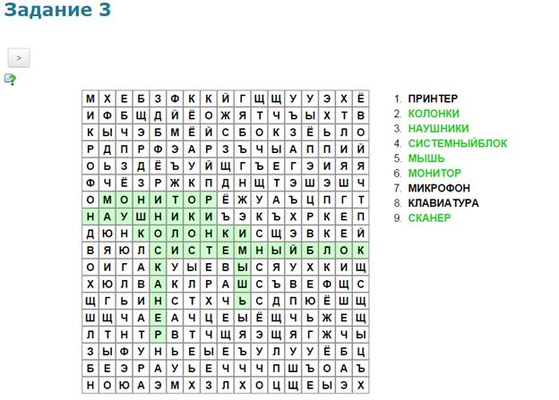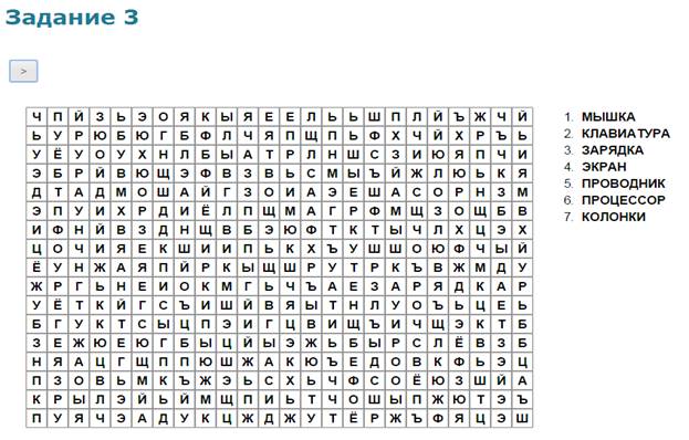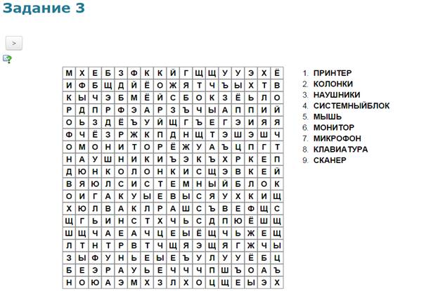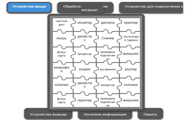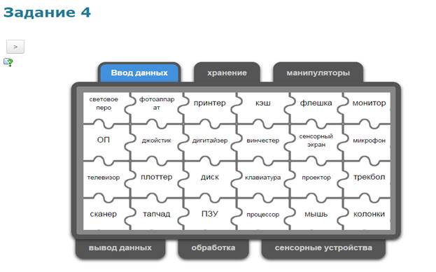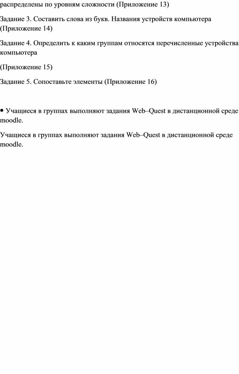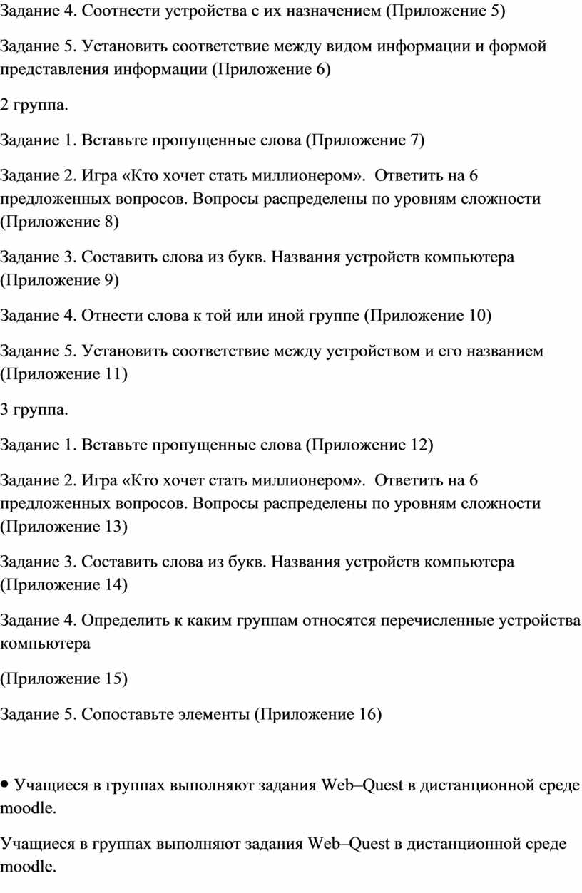 Учащиеся в системе дистанционного обучения проходят Web–Quest. Для каждой группы учащихся разработаны аналогичные друг с другом задания. 1 группа. Задание 1. Вставьте пропущенные слова (Приложение 2) Задание 2. Игра «Кто хочет стать миллионером». Ответить на 6 предложенных вопросов. Вопросы распределены по уровням сложности (Приложение 3) Задание 3. Составить слова из букв. Названия устройств компьютера (Приложение 4) Задание 4. Соотнести устройства с их назначением (Приложение 5) Задание 5. Установить соответствие между видом информации и формой представления информации (Приложение 6) 2 группа. Задание 1. Вставьте пропущенные слова (Приложение 7) Задание 2. Игра «Кто хочет стать миллионером». Ответить на 6 предложенных вопросов. Вопросы распределены по уровням сложности (Приложение 8) Задание 3. Составить слова из букв. Названия устройств компьютера (Приложение 9) Задание 4. Отнести слова к той или иной группе (Приложение 10) Задание 5. Установить соответствие между устройством и его названием (Приложение 11) 3 группа. Задание 1. Вставьте пропущенные слова (Приложение 12) Задание 2. Игра «Кто хочет стать миллионером». Ответить на 6 предложенных вопросов. Вопросы распределены по уровням сложности (Приложение 13) Задание 3. Составить слова из букв. Названия устройств компьютера (Приложение 14) Задание 4. Определить к каким группам относятся перечисленные устройства компьютера (Приложение 15) Задание 5. Сопоставьте элементы (Приложение 16)