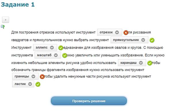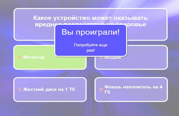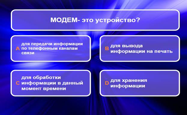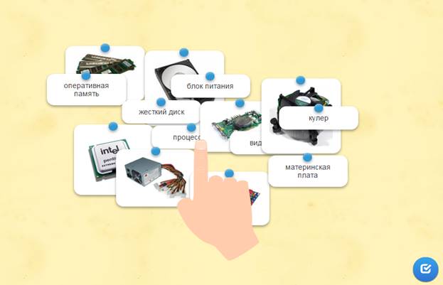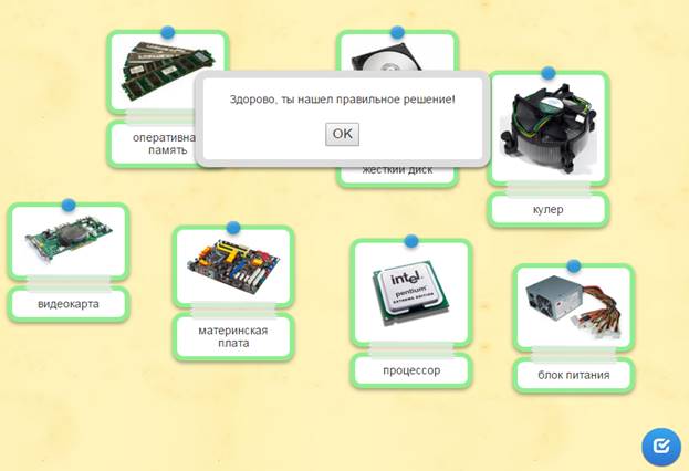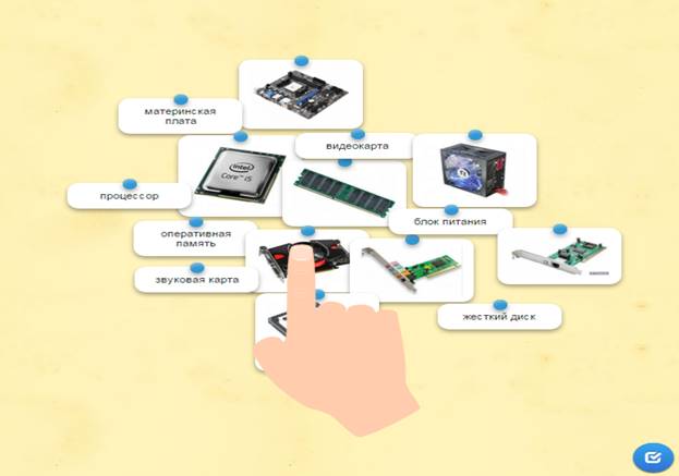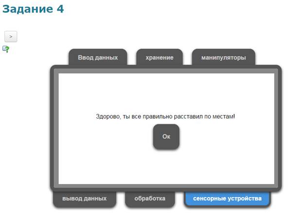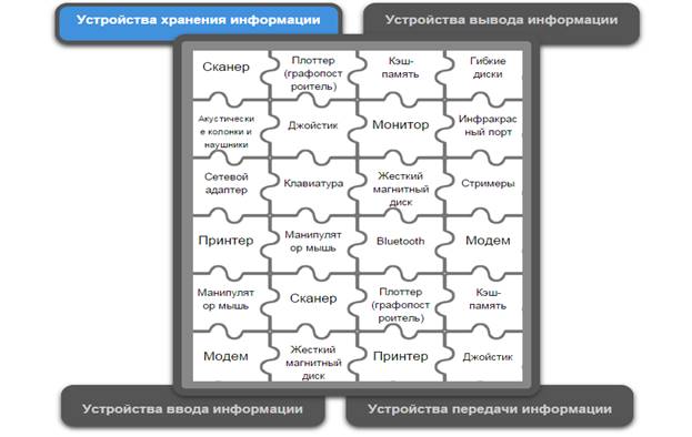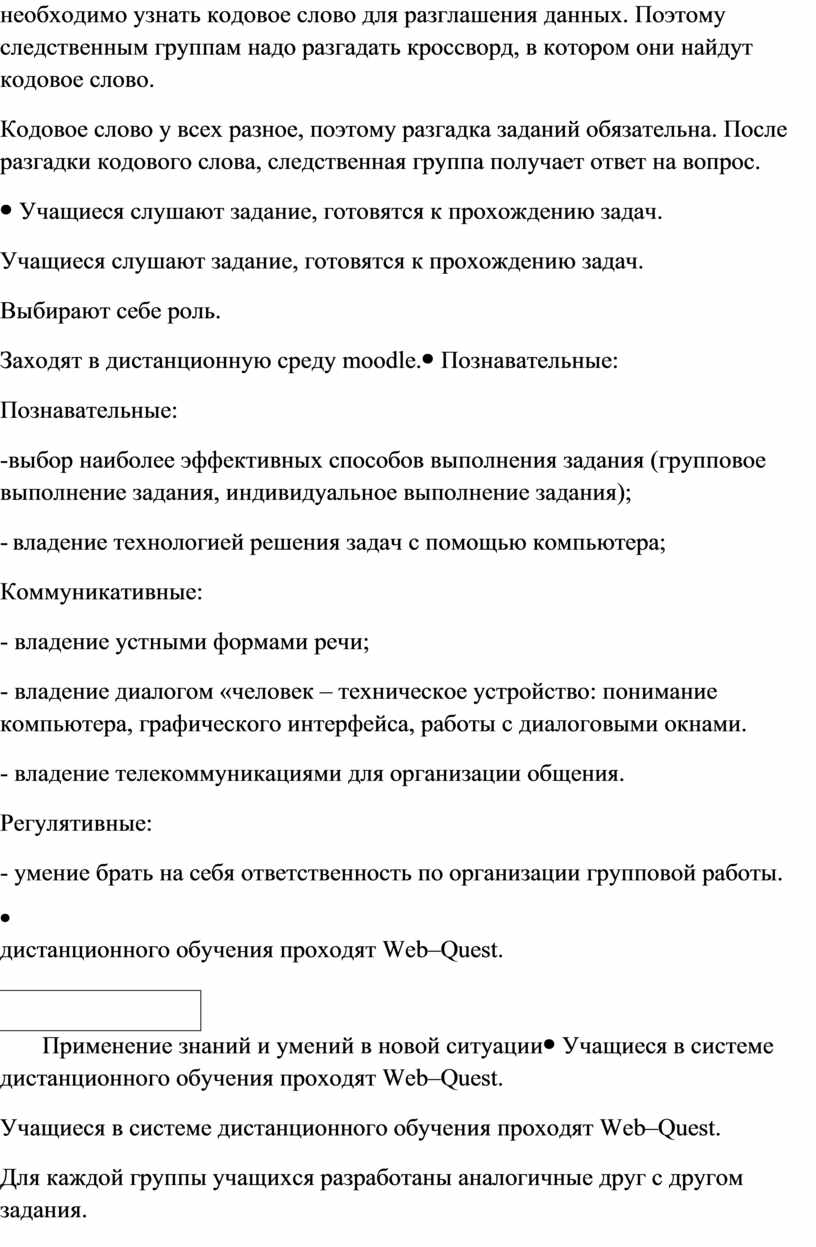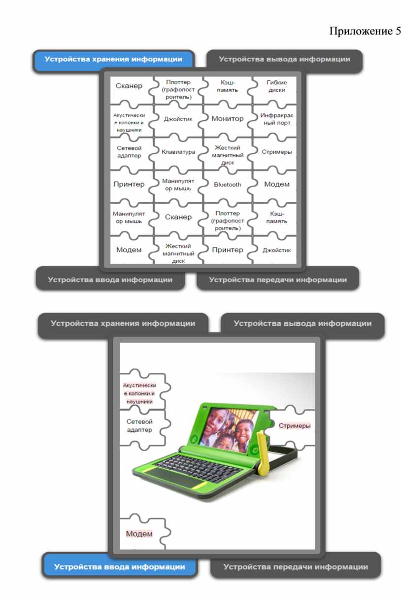Учащиеся в системе дистанционного обучения проходят Web–Quest. Для каждой группы учащихся разработаны аналогичные друг с другом задания. 1 группа. Задание 1. Вставьте пропущенные слова (Приложение 2) Задание 2. Игра «Кто хочет стать миллионером». Ответить на 6 предложенных вопросов. Вопросы распределены по уровням сложности (Приложение 3) Задание 3. Составить слова из букв. Названия устройств компьютера (Приложение 4) Задание 4. Соотнести устройства с их назначением (Приложение 5) Задание 5. Установить соответствие между видом информации и формой представления информации (Приложение 6) 2 группа. Задание 1. Вставьте пропущенные слова (Приложение 7) Задание 2. Игра «Кто хочет стать миллионером». Ответить на 6 предложенных вопросов. Вопросы распределены по уровням сложности (Приложение 8) Задание 3. Составить слова из букв. Названия устройств компьютера (Приложение 9) Задание 4. Отнести слова к той или иной группе (Приложение 10) Задание 5. Установить соответствие между устройством и его названием (Приложение 11) 3 группа. Задание 1. Вставьте пропущенные слова (Приложение 12) Задание 2. Игра «Кто хочет стать миллионером». Ответить на 6 предложенных вопросов. Вопросы распределены по уровням сложности (Приложение 13) Задание 3. Составить слова из букв. Названия устройств компьютера (Приложение 14) Задание 4. Определить к каким группам относятся перечисленные устройства компьютера (Приложение 15) Задание 5. Сопоставьте элементы (Приложение 16)